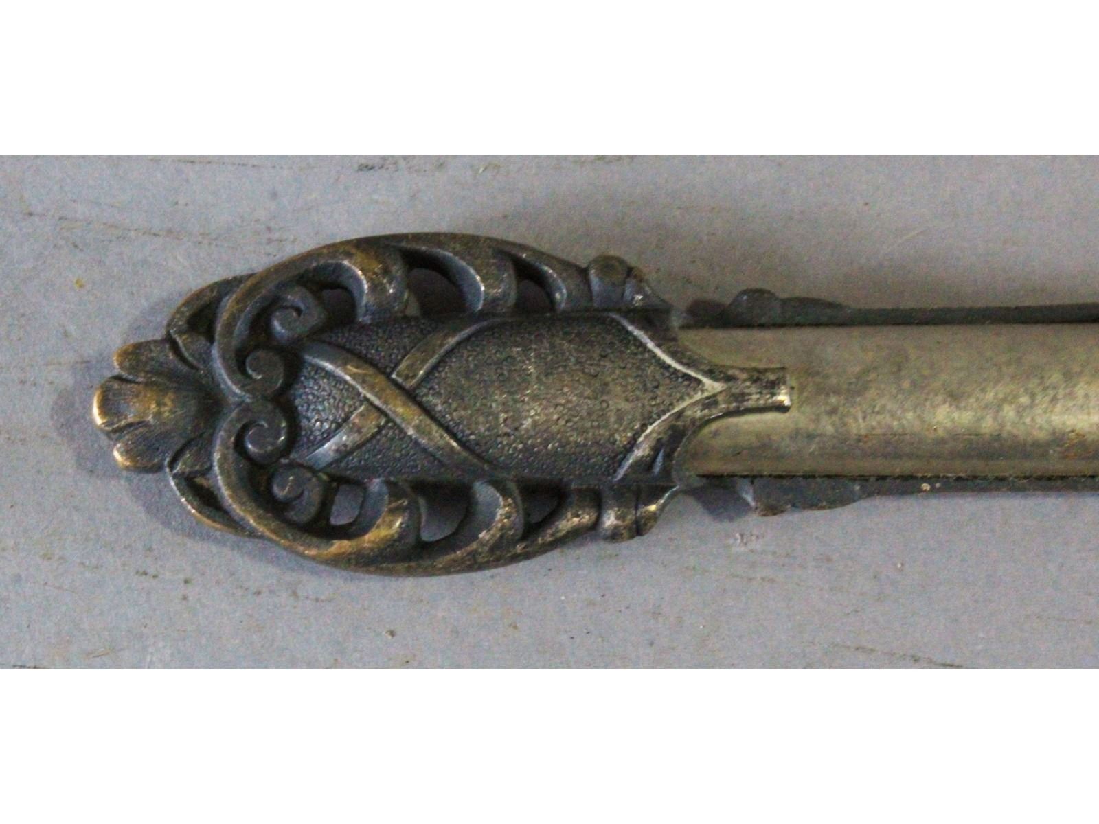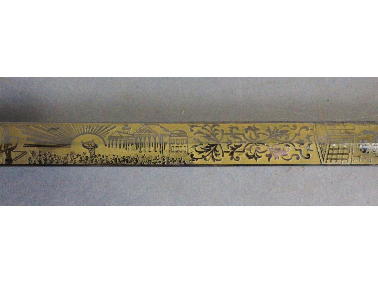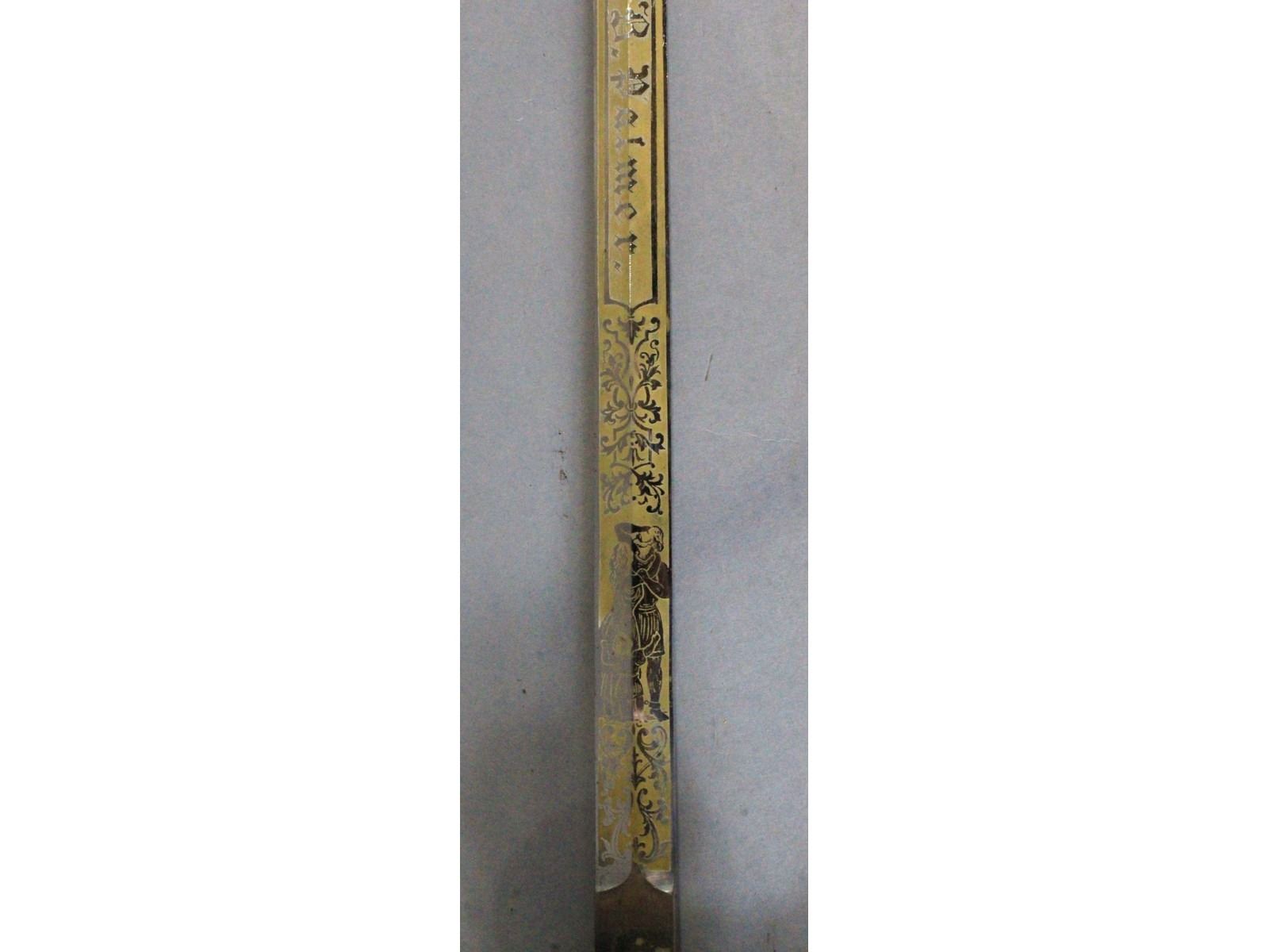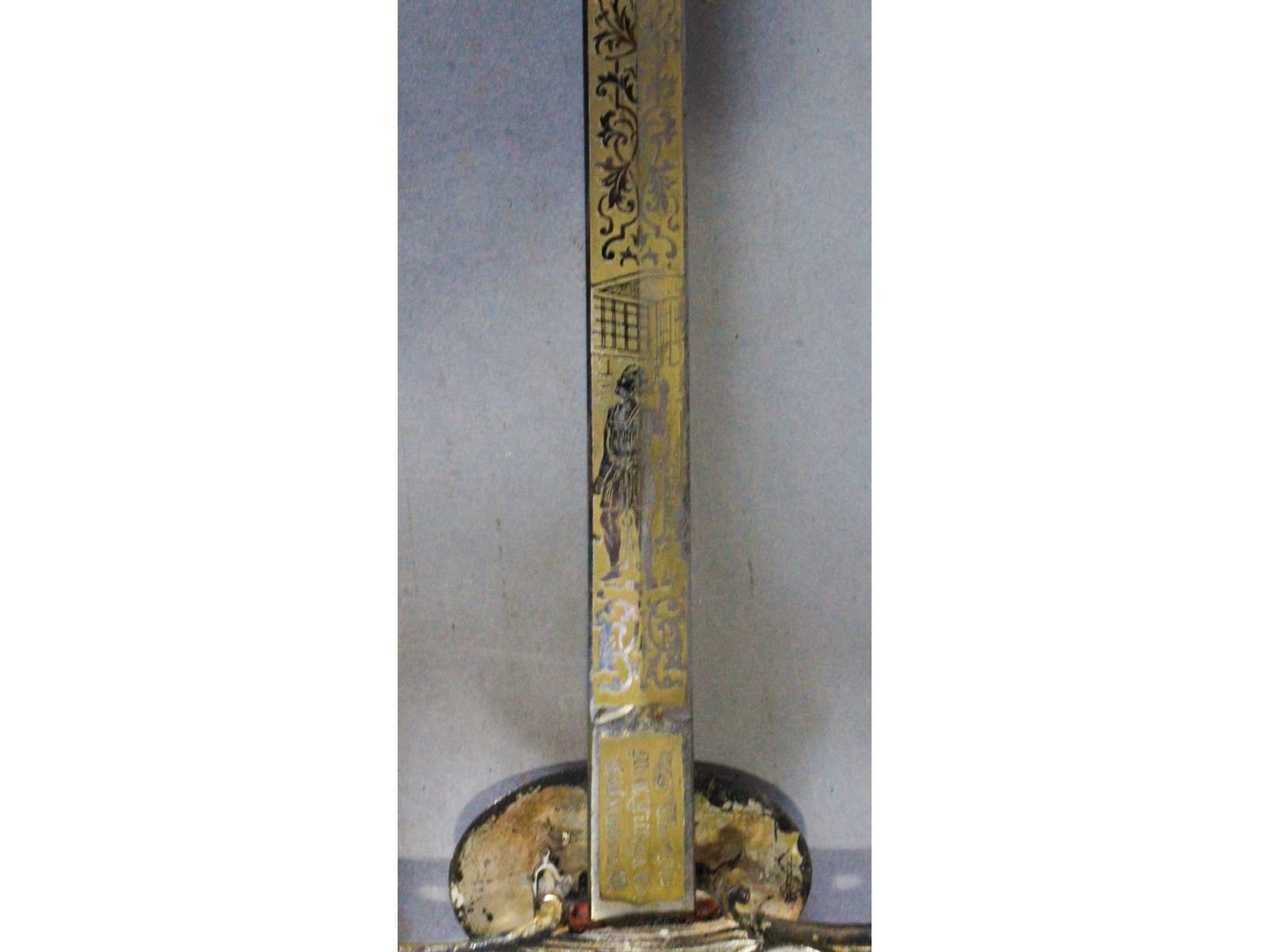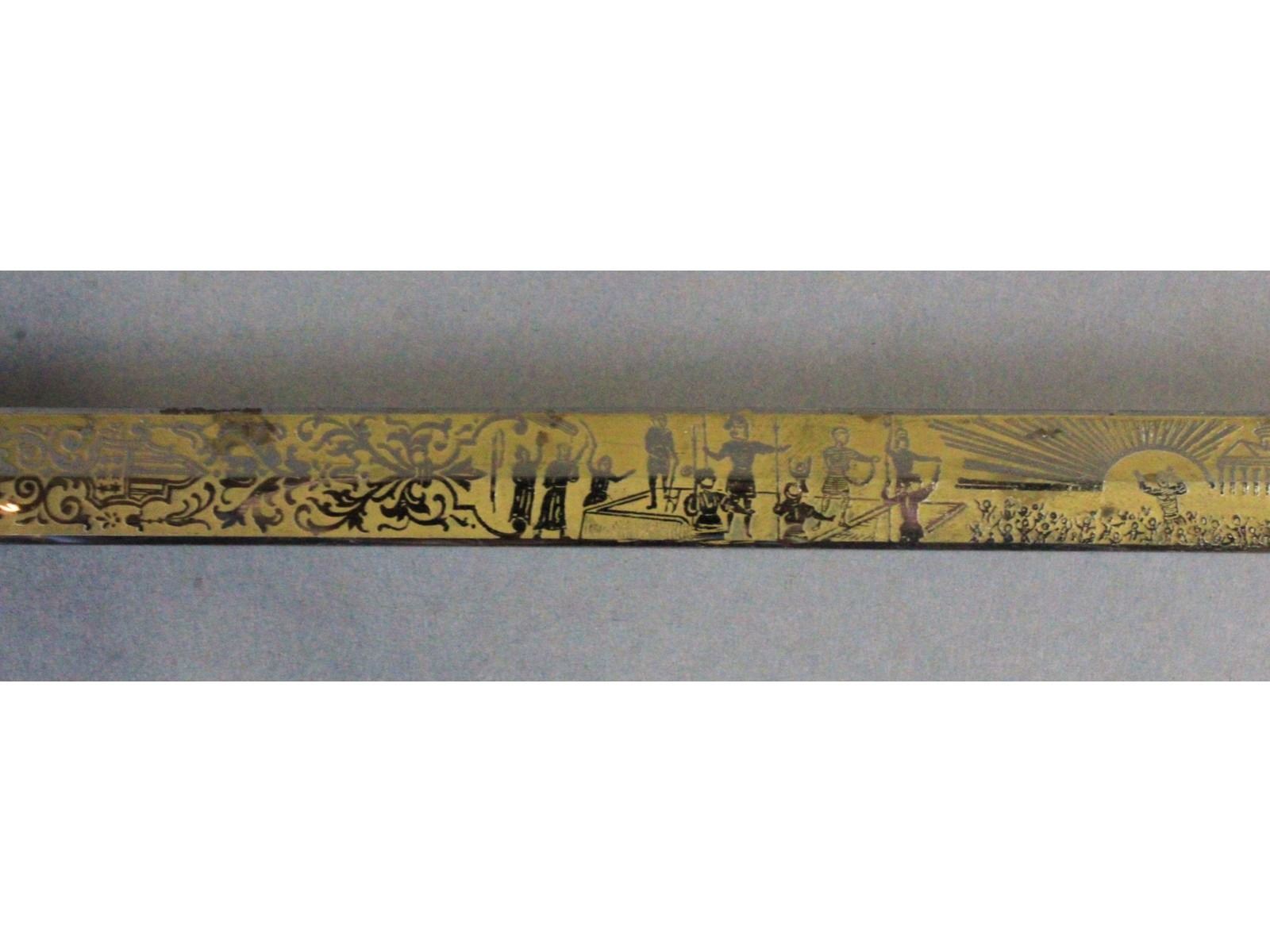 Blade is very nice, etched in gold with the owners name, A T R Palmer. Also marked MC Lily Company, Columbus, Ohio. Hilt is missing most of it's original gold plating. Leather grip with brass wire. Leather has some scuffs in it. Chain guard. Nickel plated scabbard with fancy mounts, no dents. Good to very good condition.