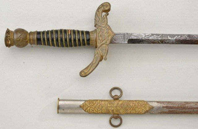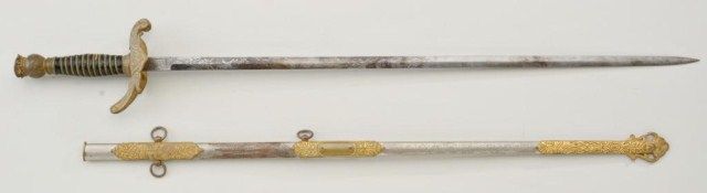 Lodge sword with scabbard; “Justis Universas” on blade with “Patriach Militant 1 of” and Belgium Lion; name removed from scabbard. Est.: $75-$150.