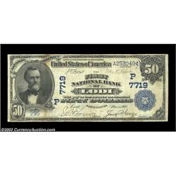 <TABLE cellSpacing=0 cellPadding=0 width="100%" bgColor=#000000 border=0><TBODY> <TR><TD width="100%"><TABLE cellSpacing=1 cellPadding=3 width="100%" border=0><TBODY><TR><TD width="100%" bgColor=#79735c><FONT face=arial color=#ffffff size=3><B>Description</B> </FONT></TD></TR><TR><TD width="100%" bgColor=#ffffff><FONT face=arial size=2><B>Lodi, CA</B></I> - $50 1902 Date Back Fr. 667 <B>The First NB</B></I> Ch. # (P)7719<BR>A tougher high denomination example from this seldom seen San Joaquin County institution. <B>Fine.</B></I> (1,250-1,750 ) </FONT></TD></TR></TBODY></TABLE></TD></TR></TBODY></TABLE><BR><TABLE cellSpacing=0 cellPadding=0 width="100%" bgColor=#000000 border=0><TBODY><TR> Important notice: Heritage usually auctions material at the rate of 200-250 lots per hour. On some occasions eBay Live bid software or the Internet may not be able to keep up with the pace of the auction. We recommend placing a realistic absentee bid now as insurance to avoid disappointment. Occasionally the auctioneer may eliminate or reject an eBay Live bid, and the auctioneer may also reopen a lot after the close of the eBay live bidding (usually because we missed an audience bid), and may reject your bid even if it shows you as the winning bidder. By bidding via eBay Live, you agree that Heritage may award the lot to another bidder at its sole discretion under the circumstances described above or any other reasonable circumstances. Also please note that all Heritage lots purchased through eBay Live carry a 20% Buyer's Premium. Please make sure you read the Terms and Conditions before you bid.</TR></TBODY></TABLE>