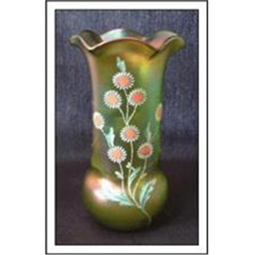 Beautiful Loetz (unsigned)- but attributed to Loetz, sunflower vase. The enamel work of the sunflowers are done exquisitely. Hand blown. Large polished ponti. Flared top with the edges gently rolled and smooth. No damage to enameling. 8 1/2"" tall. 5"" across at the top.