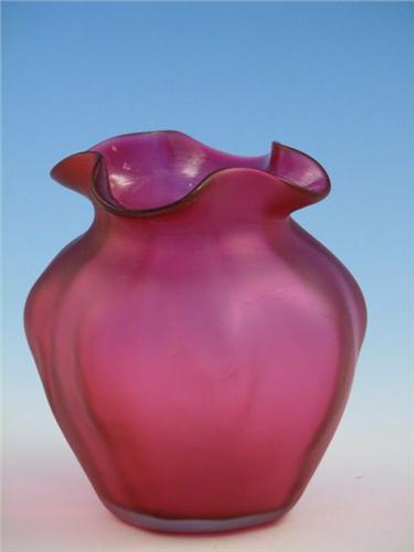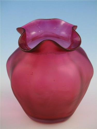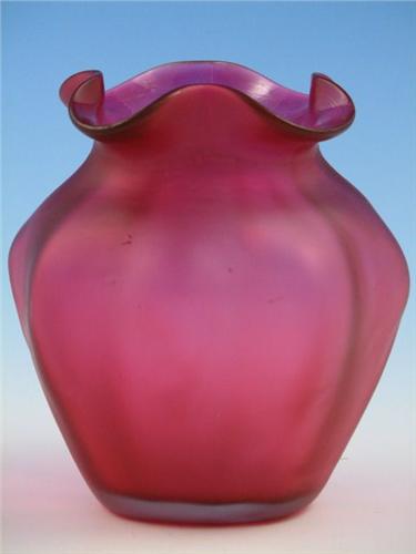Loetz Iridescent Cranberry vase. Features ribbed bulbous body with hand crimped rim. Condition: No damage noted. Dimensions: 4.25"H x 4"D.