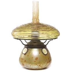 Loetz kerosene lamp attribution, bulbous base with Astraä decoration and applied medallions of bronze and iridescent glass, broad flattened shade, applied threading, original fittings, original patina to all bronze parts, shade 13.5”dia., 13.5”h, minor chips to top rim of shade, minor scratches to bottom of base, minor loss to threading