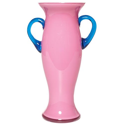Loetz vase, Tango design in pink with two handles in turquoise, 6"h