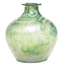 Good Loetz vase, broad form in green mottled glass with a white pulled decoration, 5”h
