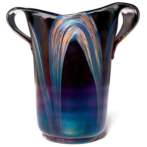 Loetz vase, large form with two handles in cobalt glass and pulled design in blue, green and gold, 10"h