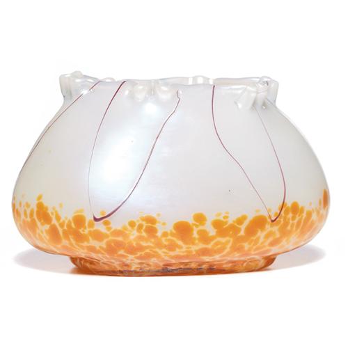 Loetz vase, attribution, low form with ruffled rim in iridescent hammered glass, unsigned, 12.5"w