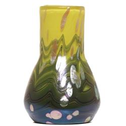 Loetz vase, small gourd form in yellow with blue and green pulled and platinum oilspot designs, 3.25"h