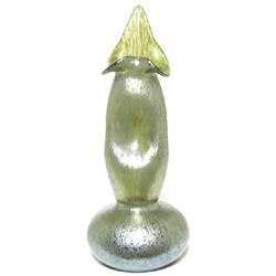 Loetz vase, unusual form with bulbous foot and indentations to neck, green glass covered with an iridescent oilspot design, 13"h