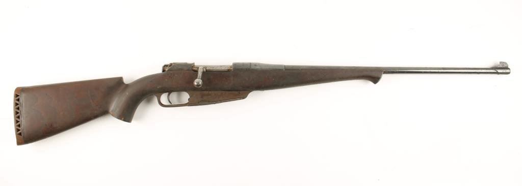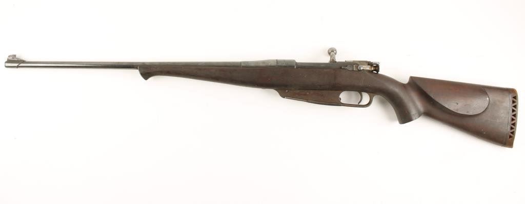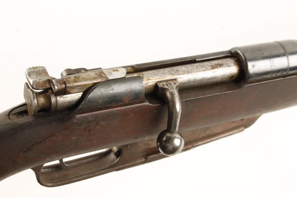 Loew Berlin marked Gem 88 bolt action rifle, dated 1891, 7.65mm cal., 23-1/2” barrel, re-blued finish with scattered spots of surface rust and erosion, wood stock, added hard rubber butt pad, #4108 in overall good condition and in need of a careful cleaning and oiling; good action, fair bore, overall good wood stock. Est.: $150-$250.