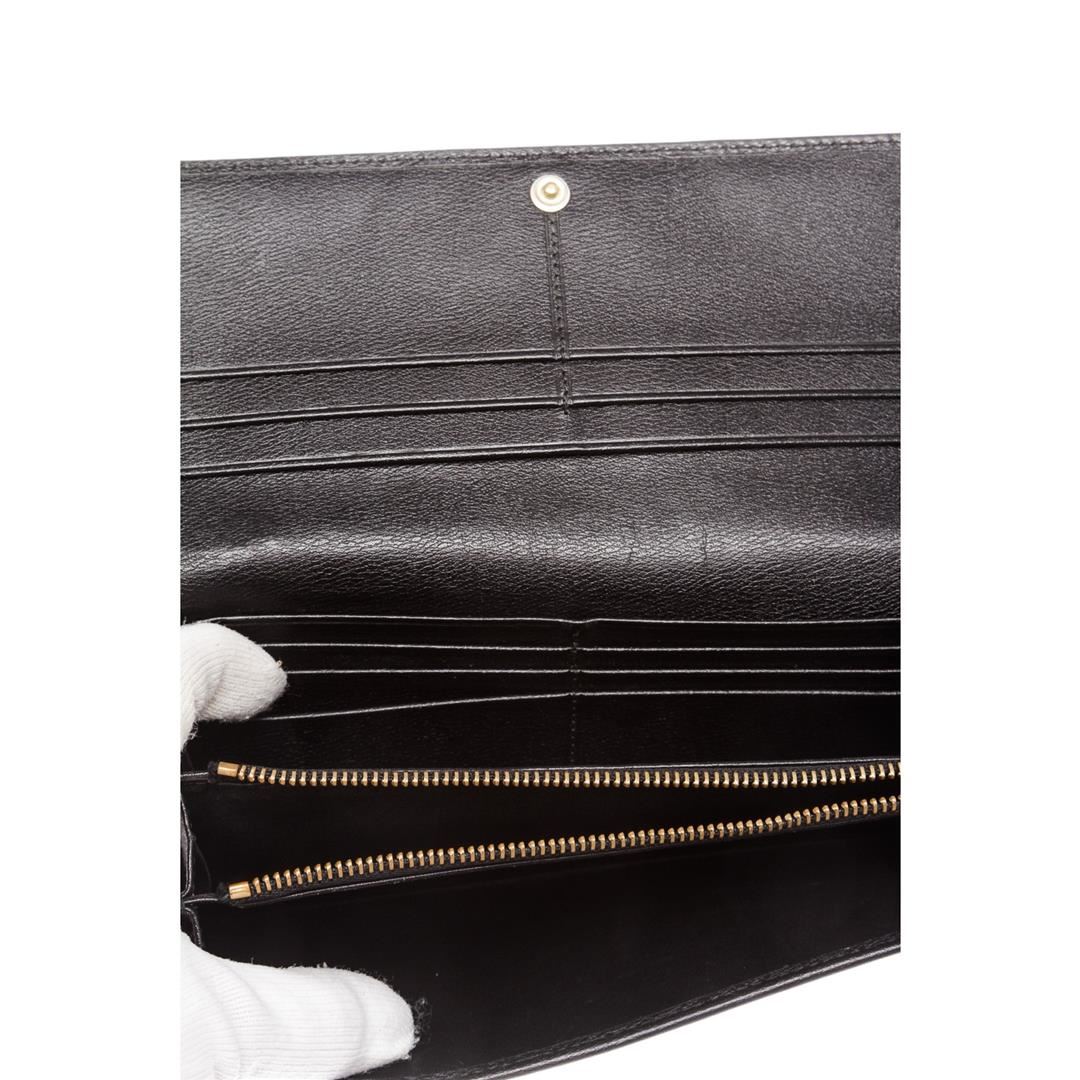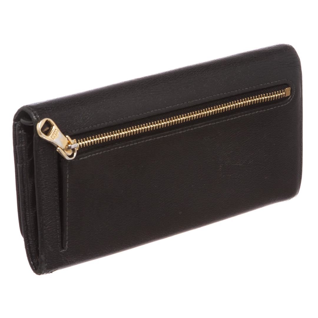 Overall flap snap closure with embellishment. Interior is leather and fabric lined and contains two compartments with zipper pocket partition, multiple credit card slip pockets and four billfold pockets. Exterior contains back zipper pocket.