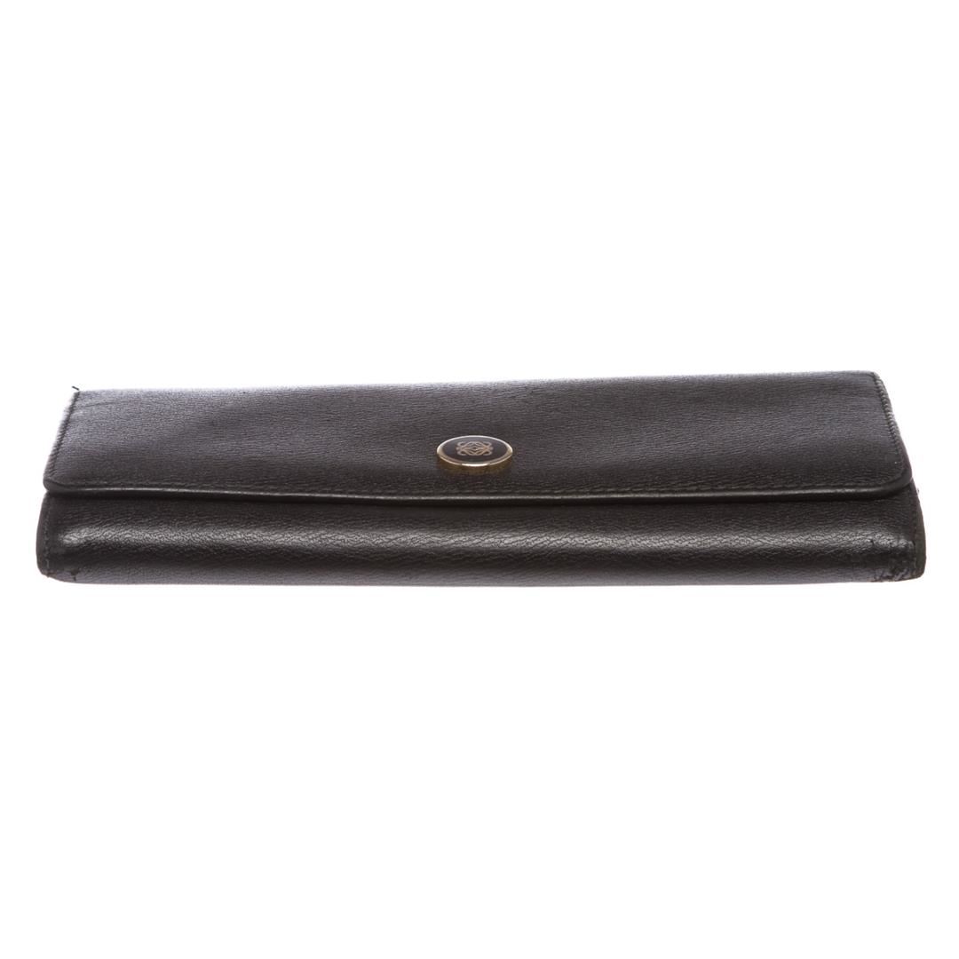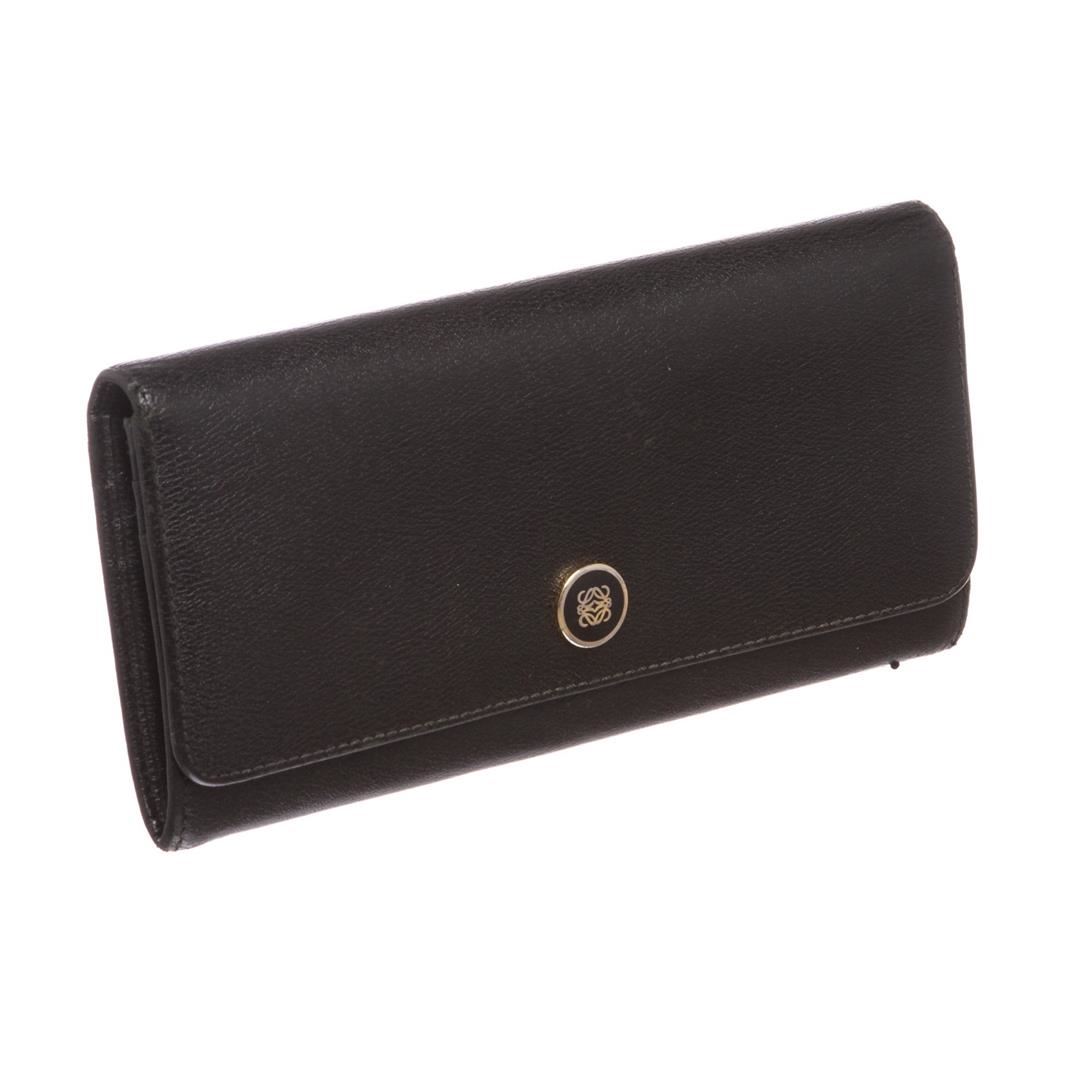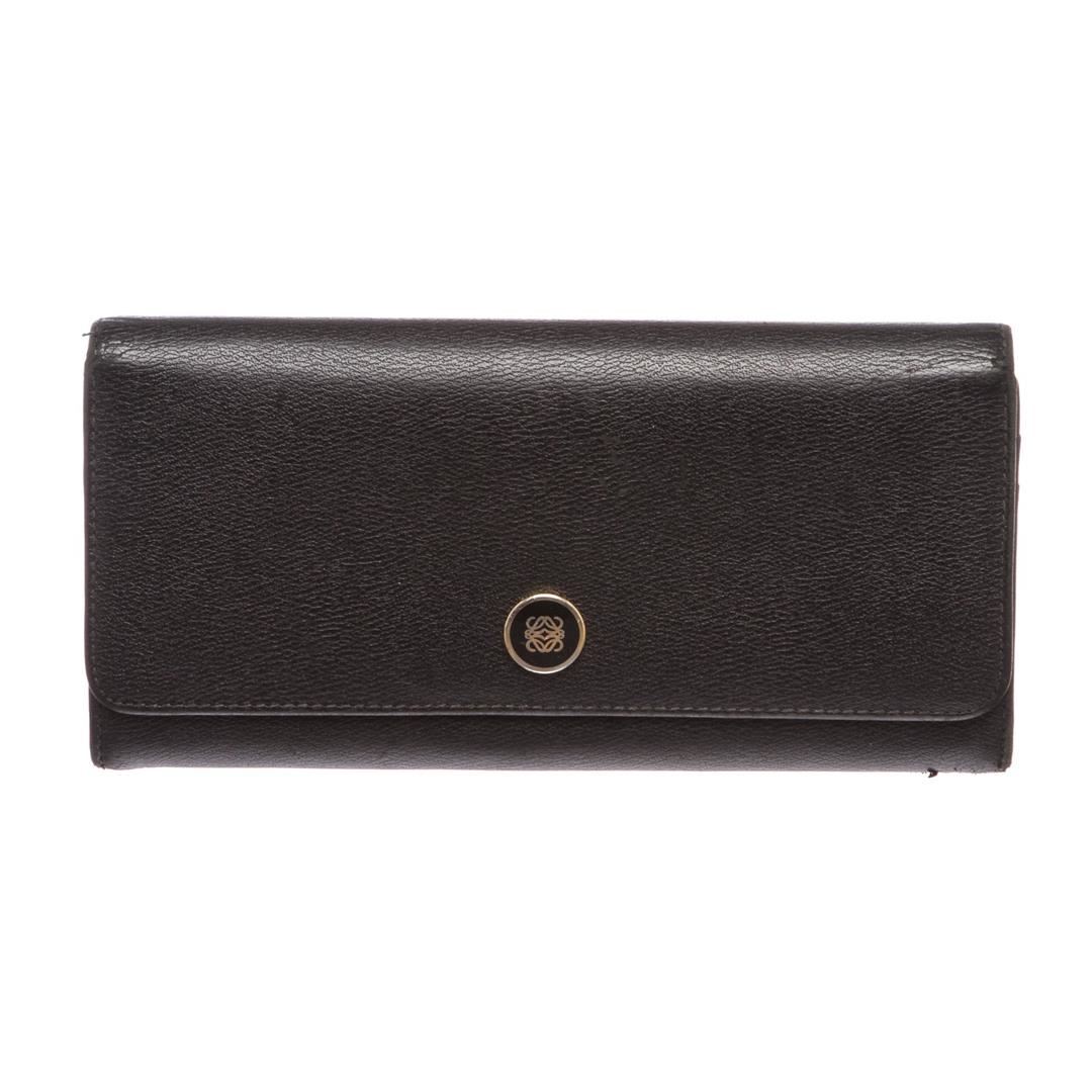Overall flap snap closure with embellishment. Interior is leather and fabric lined and contains two compartments with zipper pocket partition, multiple credit card slip pockets and four billfold pockets. Exterior contains back zipper pocket.