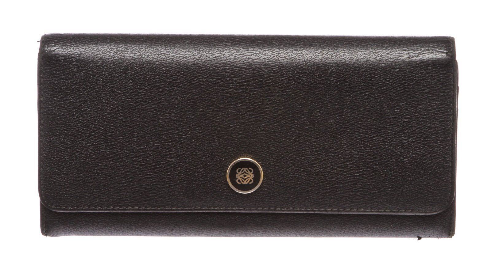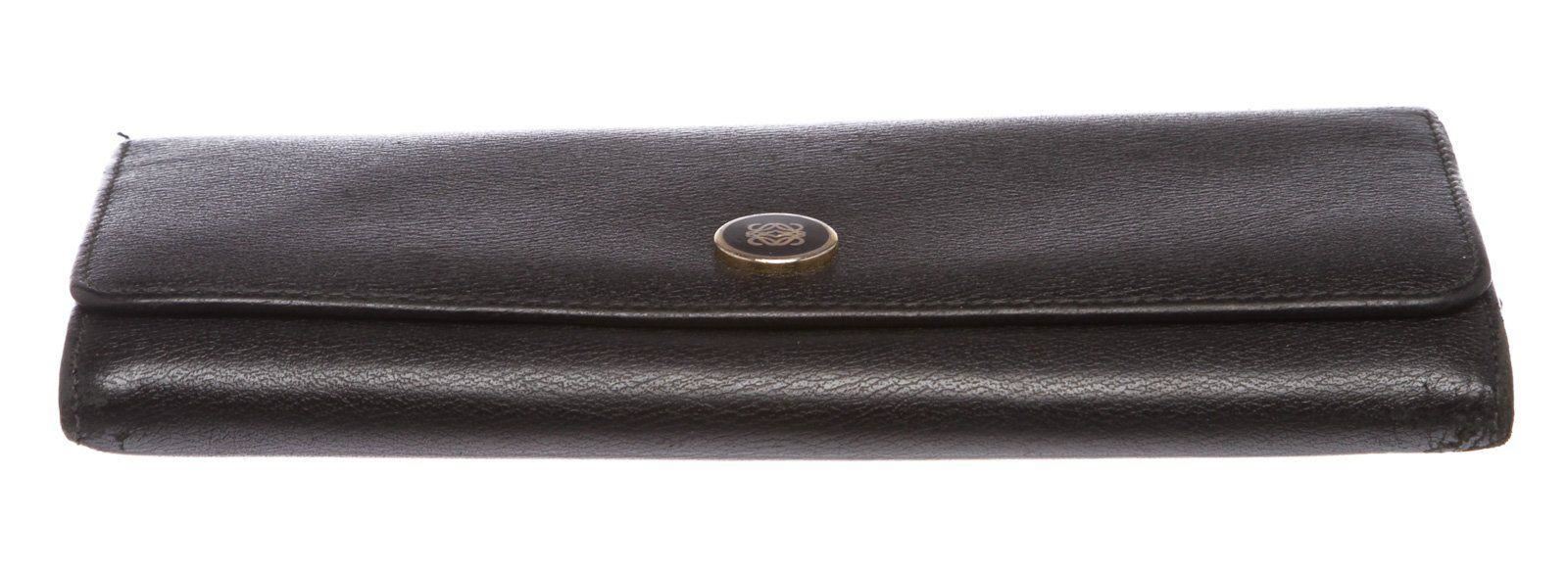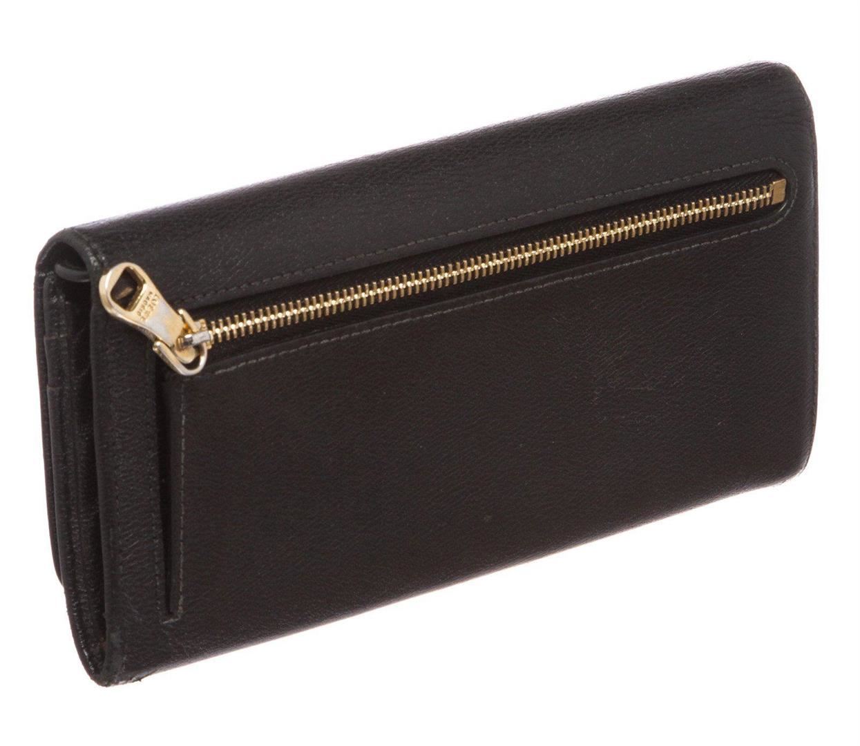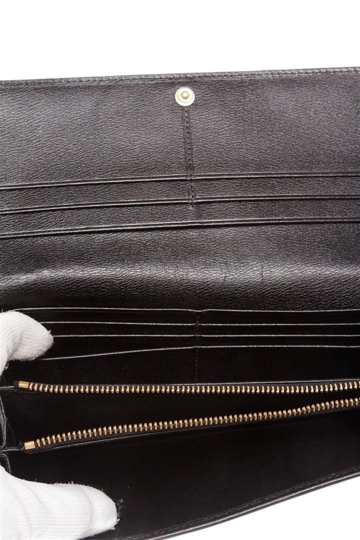 Overall flap snap closure with embellishment. Interior is leather and fabric lined and contains two compartments with zipper pocket partition, multiple credit card slip pockets and four billfold pockets. Exterior contains back zipper pocket. Measurements: Length: 7.5 in / 19 cm Width: 75 in / 191 cm 3.5 in / 9 cm Condition: Pre-Owned Good overall, please see photographs for detail.