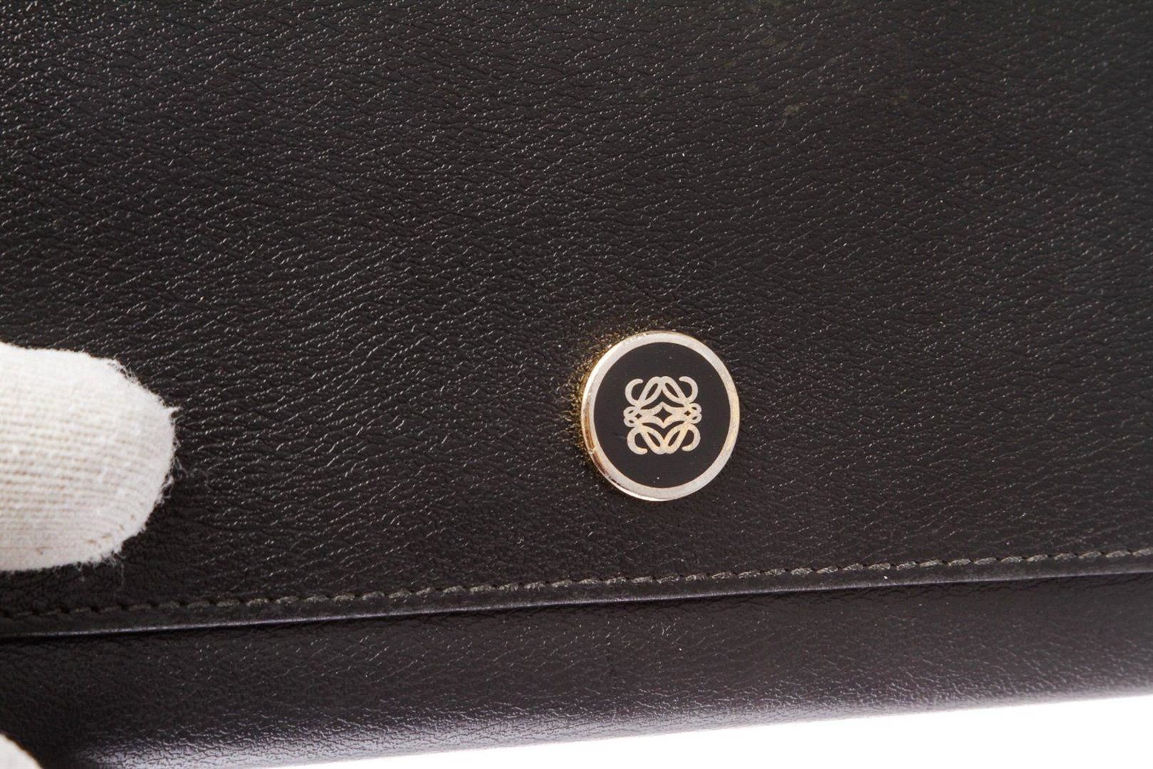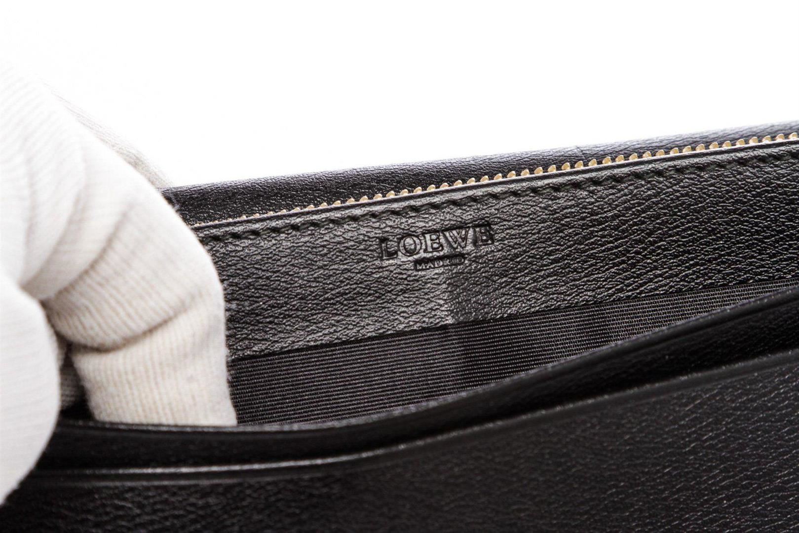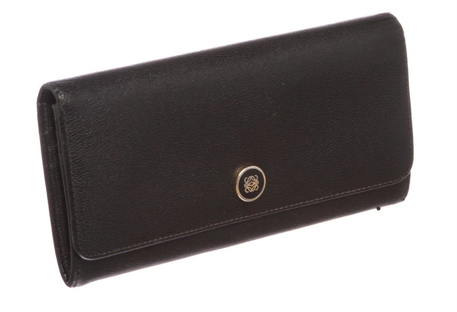 Overall flap snap closure with embellishment. Interior is leather and fabric lined and contains two compartments with zipper pocket partition, multiple credit card slip pockets and four billfold pockets. Exterior contains back zipper pocket. Measurements: Length: 7.5 in / 19 cm Width: 75 in / 191 cm 3.5 in / 9 cm Condition: Pre-Owned Good overall, please see photographs for detail.