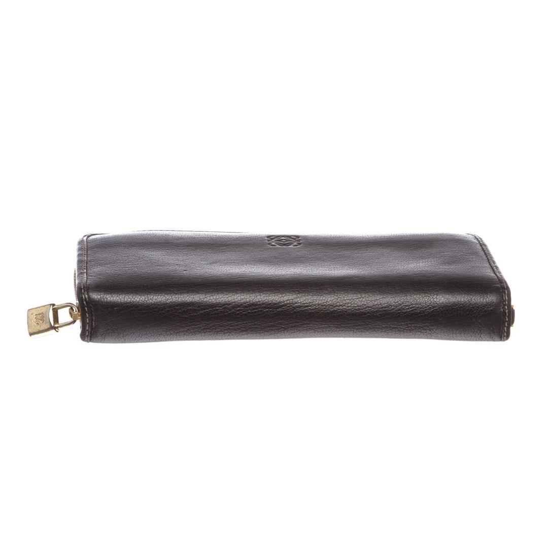 Overall zip-around closure. Interior is leather lined and contains three compartments one zipper pocket partition. Interior also includes twelve credit card slip pockets and three billfold slip pockets. Exterior contain gold-tone hardware and embossed logo at front.