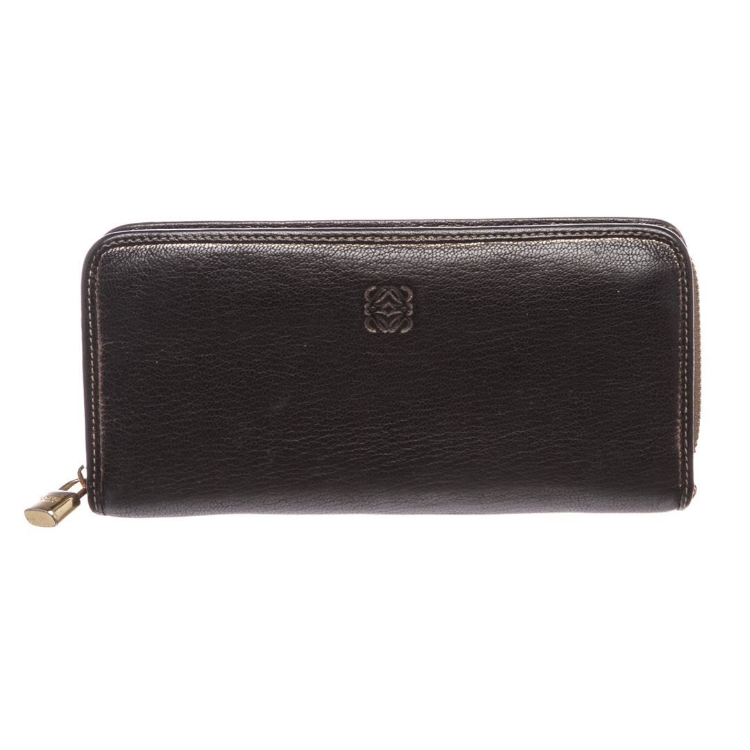 Overall zip-around closure. Interior is leather lined and contains three compartments one zipper pocket partition. Interior also includes twelve credit card slip pockets and three billfold slip pockets. Exterior contain gold-tone hardware and embossed logo at front.