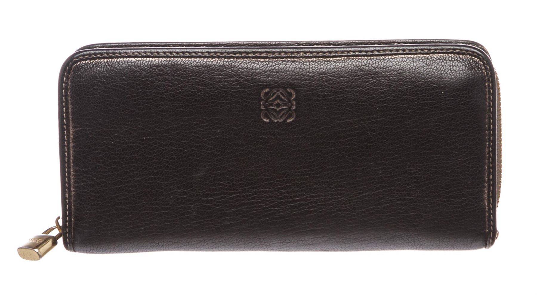 Overall zip-around closure. Interior is leather lined and contains three compartments one zipper pocket partition. Interior also includes twelve credit card slip pockets and three billfold slip pockets. Exterior contains gold-tone hardware and embossed logo at front.