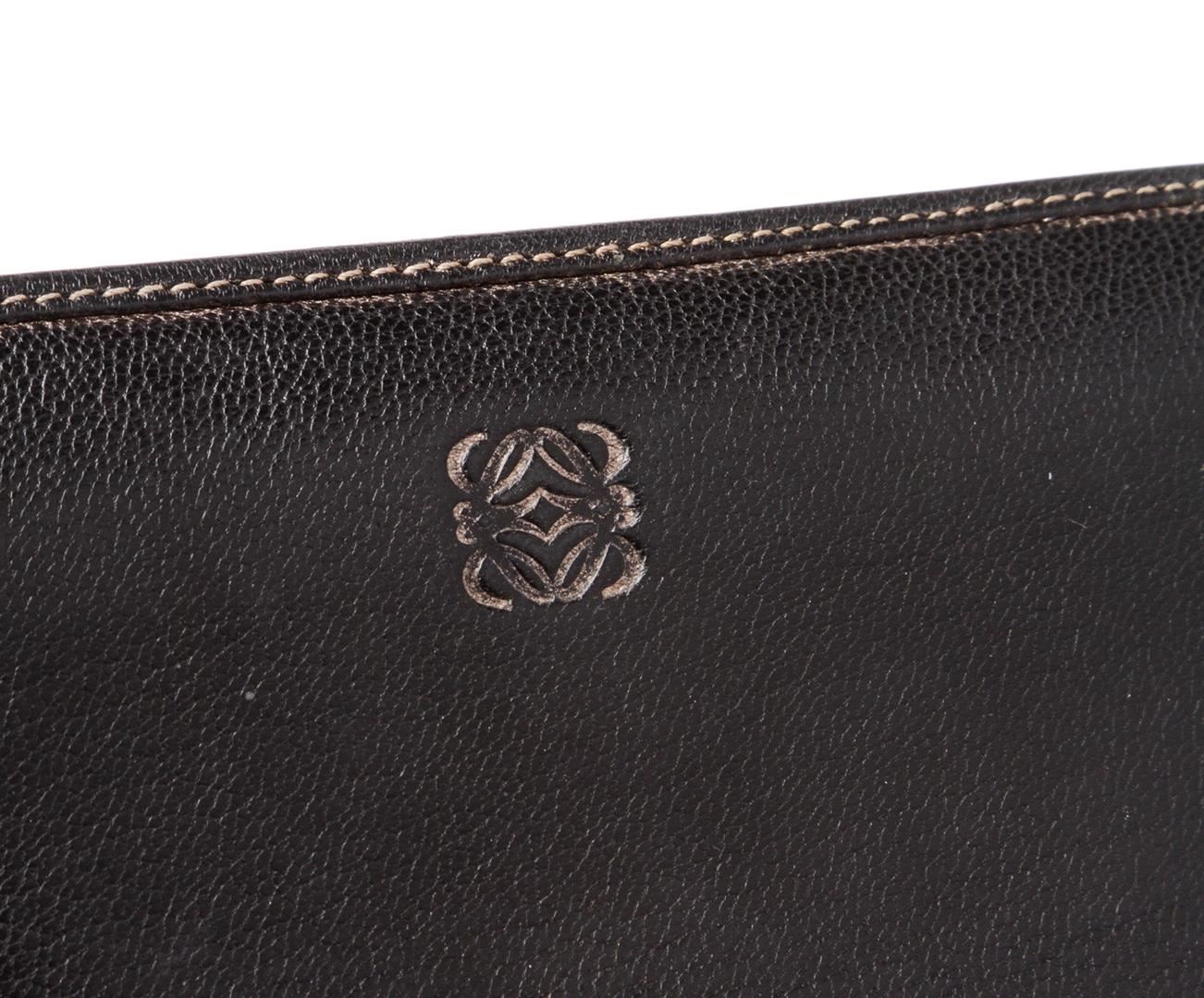 Overall zip-around closure. Interior is leather lined and contains three compartments one zipper pocket partition. Interior also includes twelve credit card slip pockets and three billfold slip pockets. Exterior contains gold-tone hardware and embossed lo