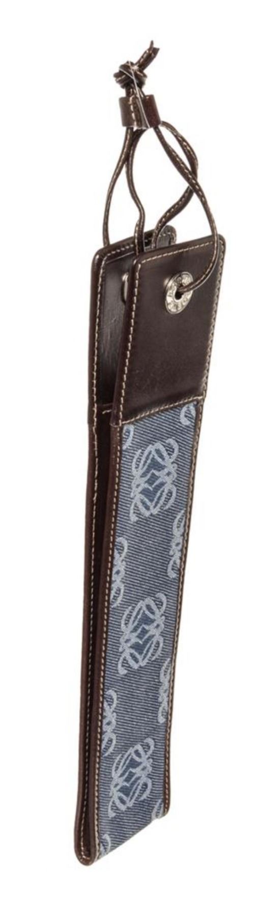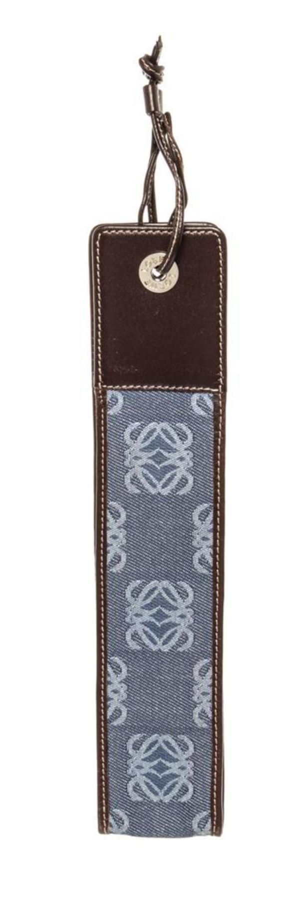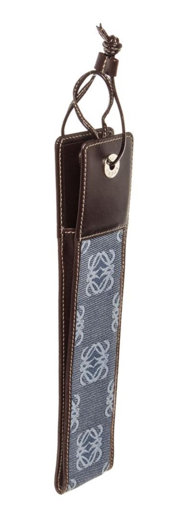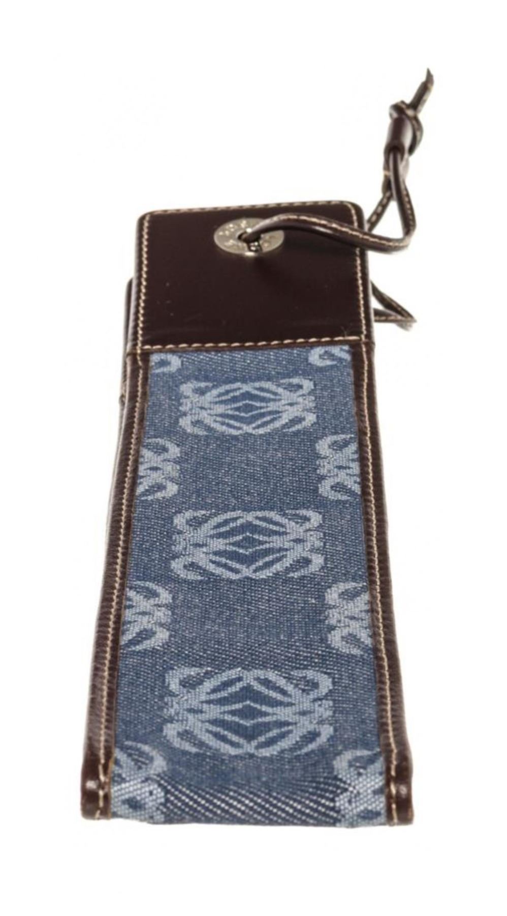 Blue monogram canvas Loewe Micro Mini pouch with silver-tone hardware, brown leather trim and leather strap. 5"x0.8"x0.2"