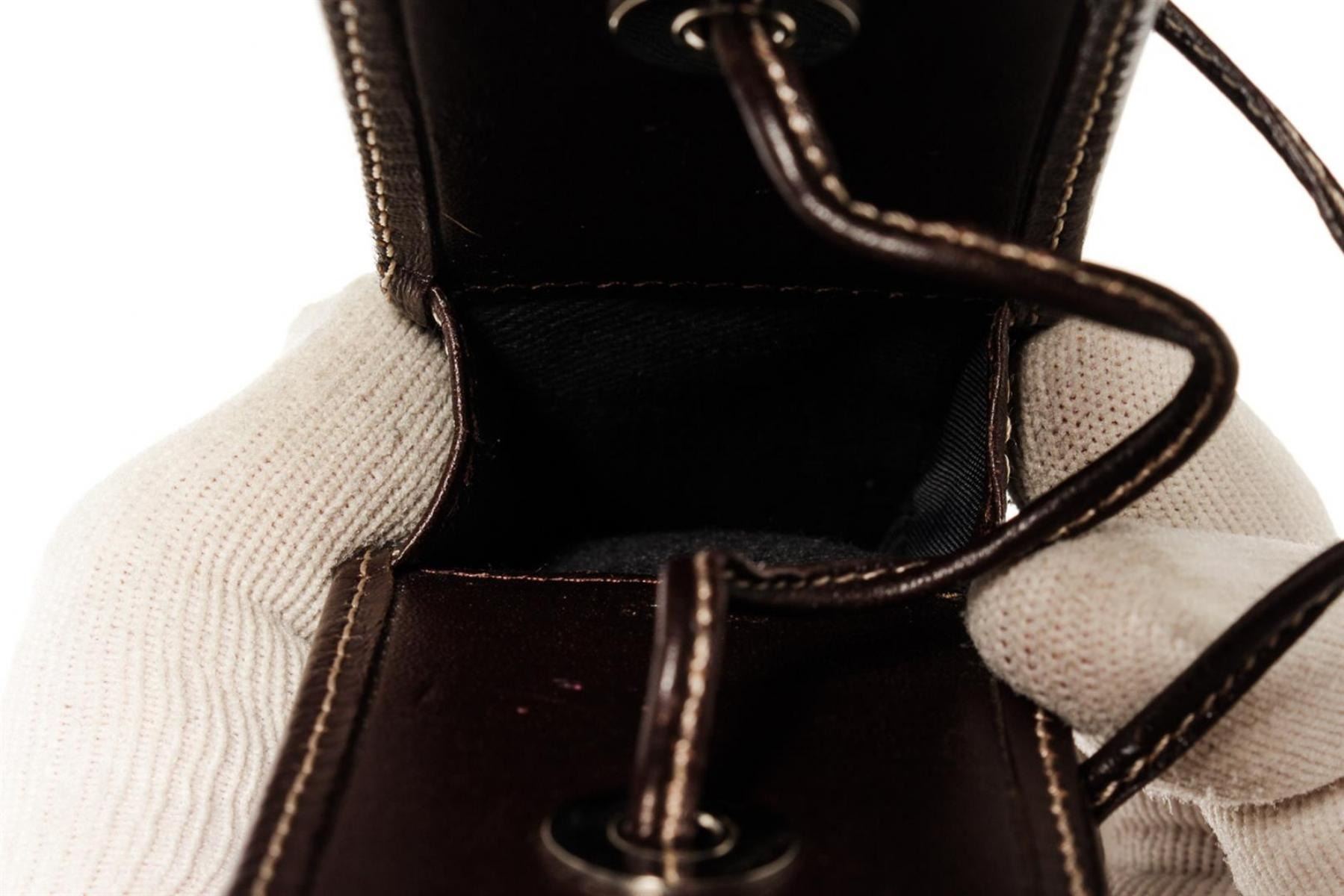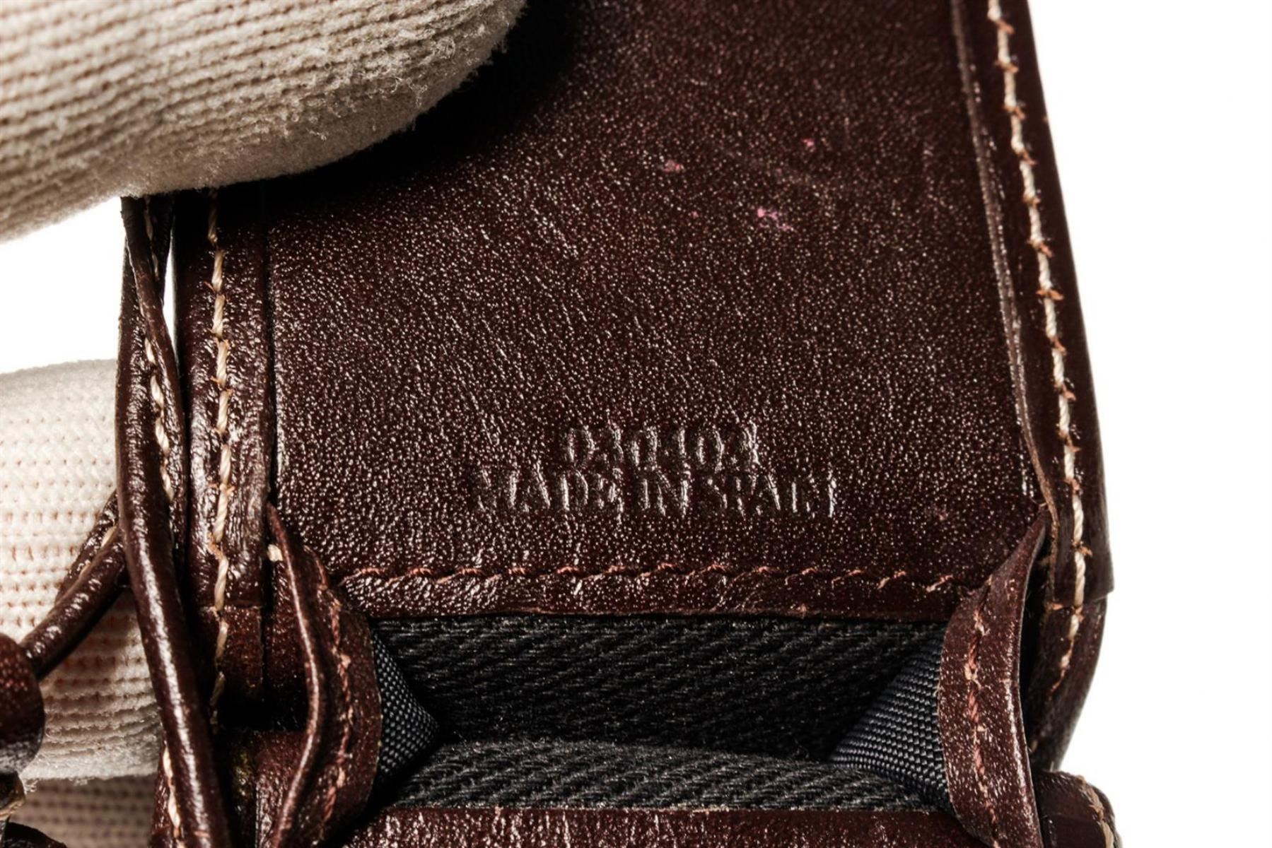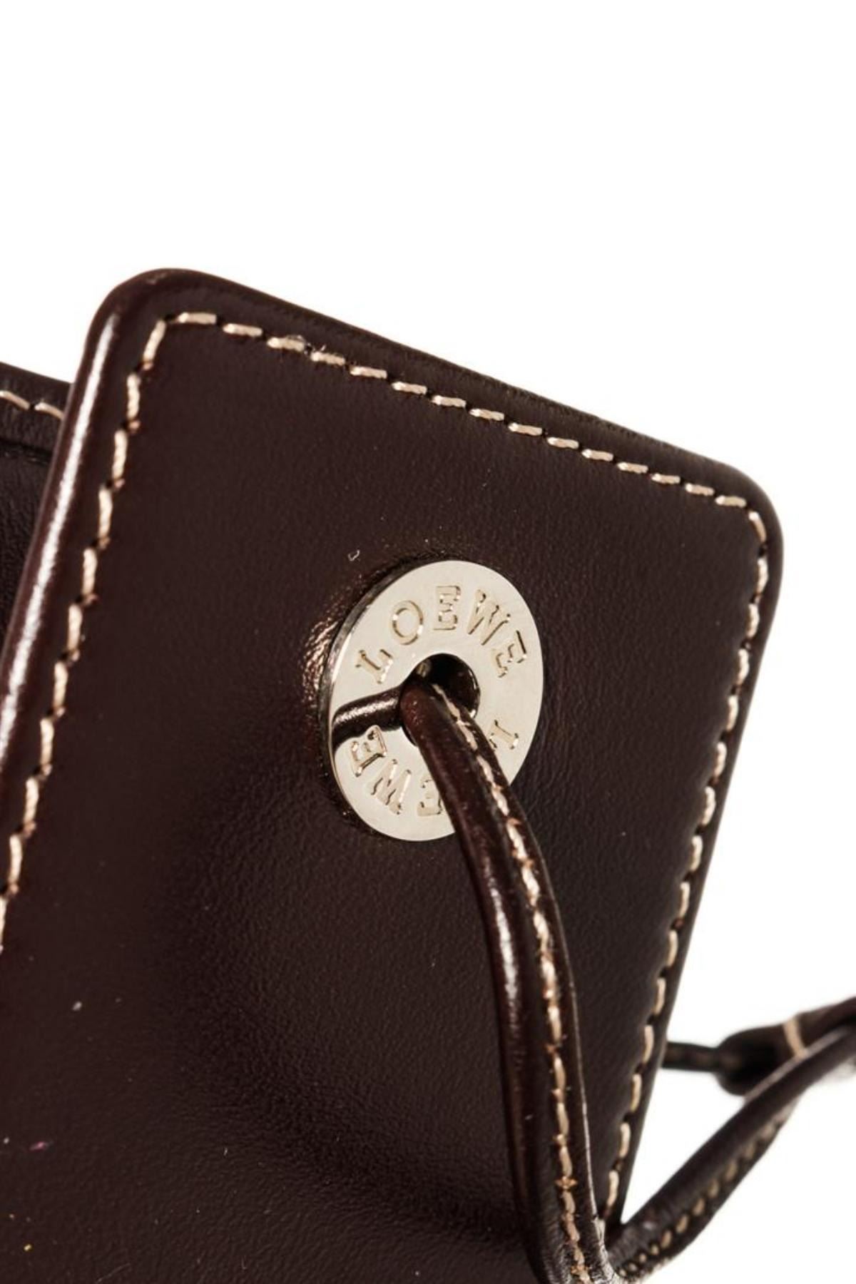 Blue monogram canvas Loewe Micro Mini pouch with silver-tone hardware, brown leather trim and leather strap. 5"x0.8"x0.2"