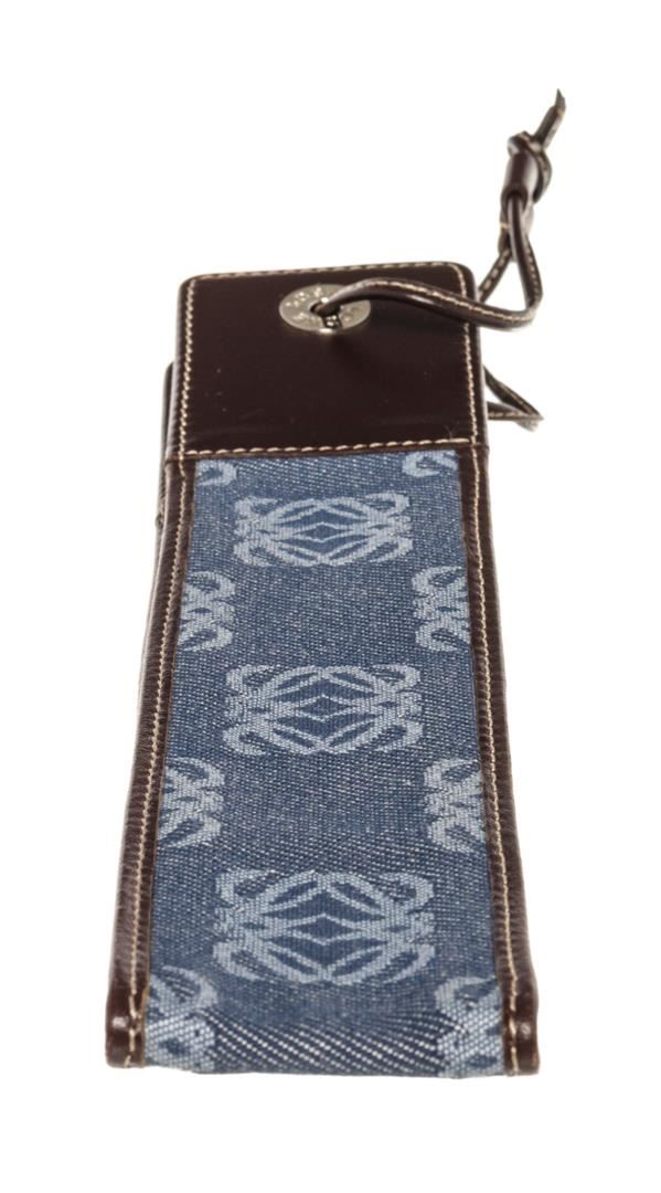 Blue monogram canvas Loewe Micro Mini pouch with silver-tone hardware, brown leather trim and leather strap. 5"x0.8"x0.2"