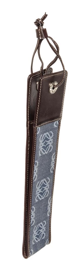 Blue monogram canvas Loewe Micro Mini pouch with silver-tone hardware, brown leather trim and leather strap. 5"x0.8"x0.2"