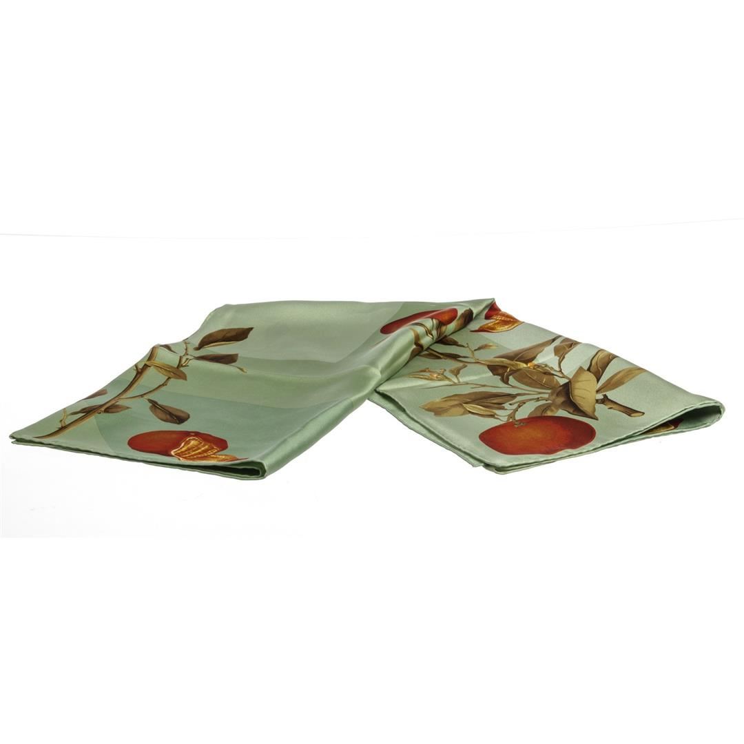 Green Loewe silk orange tree printed scarf. Dimensions = 35"x35"/88.9cmx88.9cm. Item is pre-owned.
