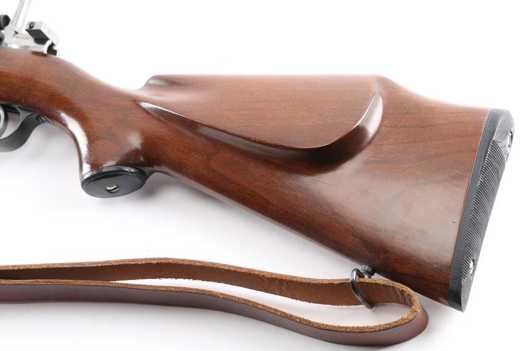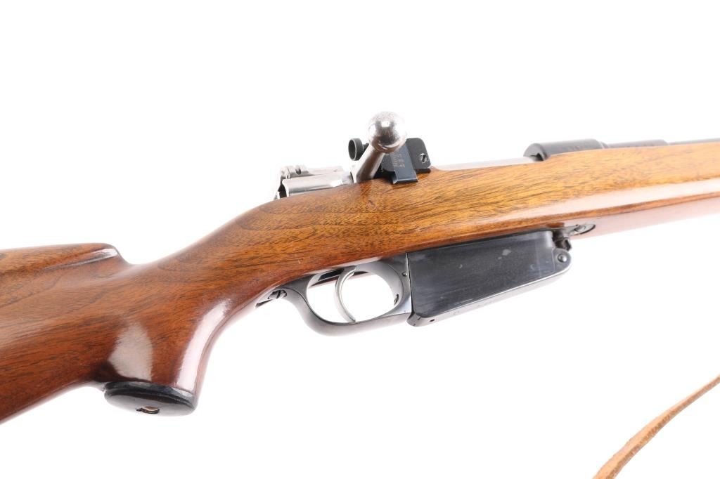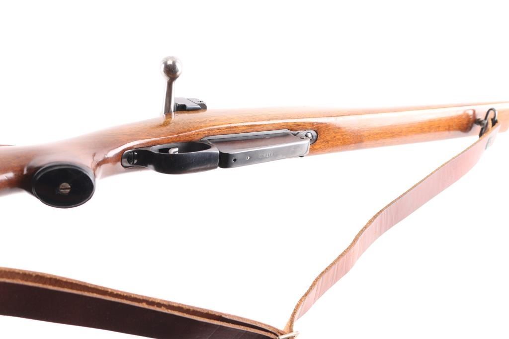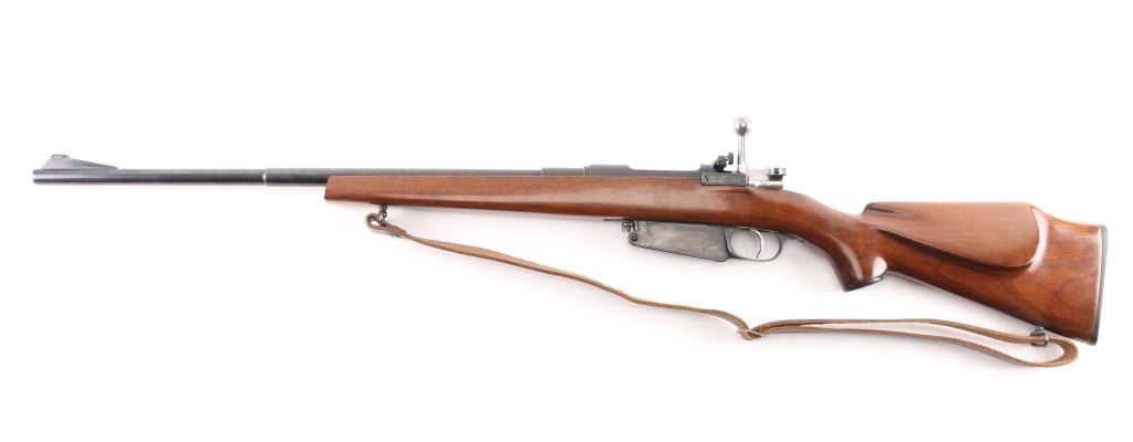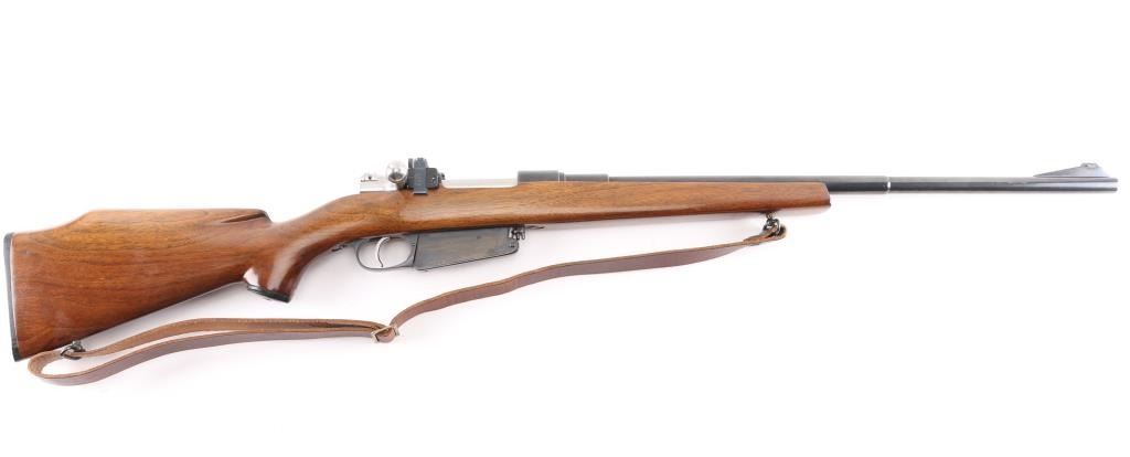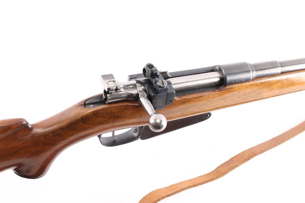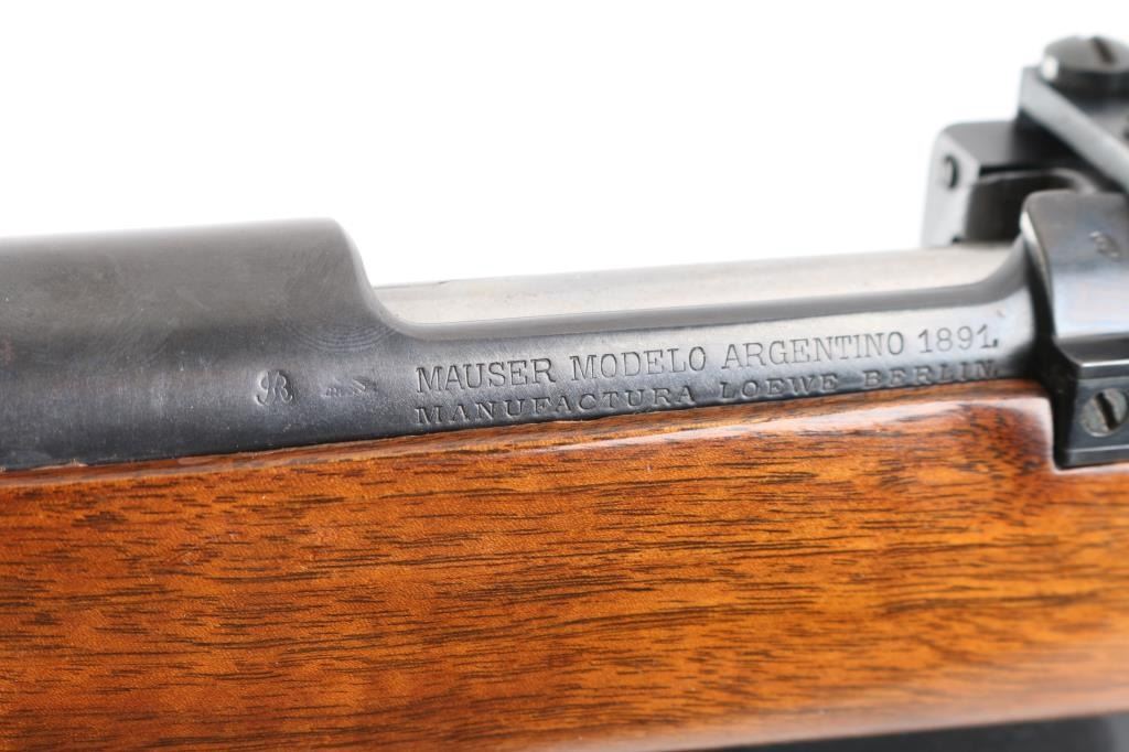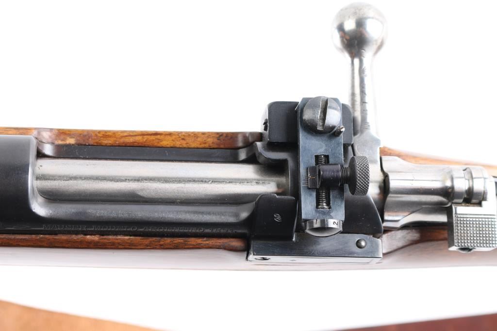 Bolt-Action rifle chambered in 7.65 X 53mm. Manufactured 18985. This is a German made Mauser rifle made under contract with Argentina has been restored/sporterized. 24" Barrel with ramped post/bead front sight, rear sight sight removed. Redfield adjustable rear sight installed on the receiver. Five round box magazine. Maker markings on left receiver rail. Retains 98% of it's blued finish. Fajen sporter stock with black grip, high comb, shadow line cheekpiece for right handed shooting, brown leather sling. No top handguard. Bore appears very good/bright, needs cleaning. Action is smooth/tight. Numbers match on barrel, receiver, bolt and magazine. Wood is very good.