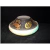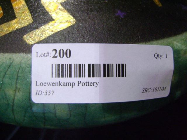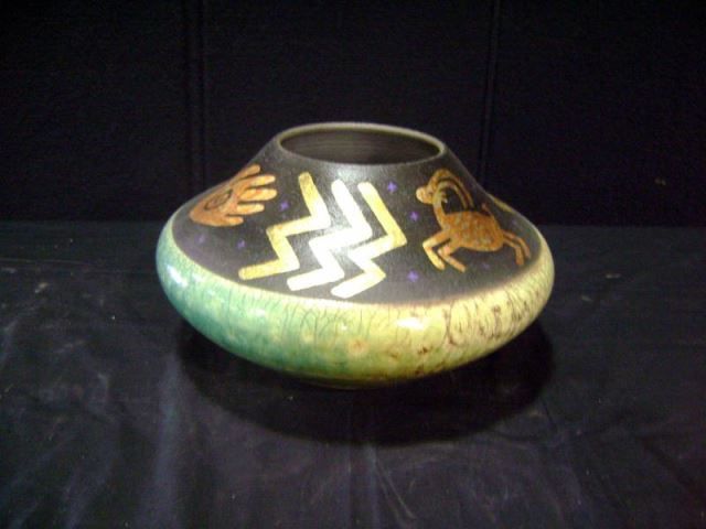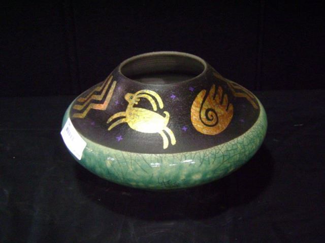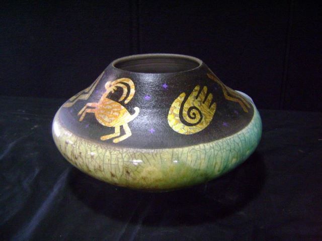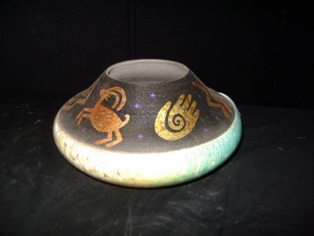 Loewenkamp Pottery, Raku Bowl w/ Hand and Other Designs in Reticulated Gold 6 1/2"x10 1/2"x4 1/4" Re