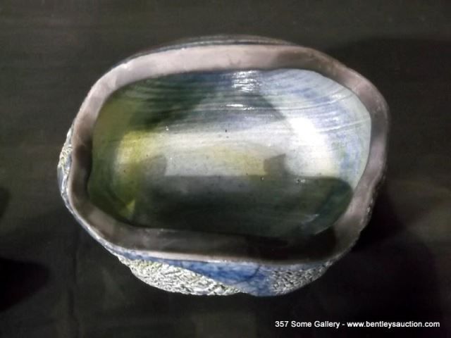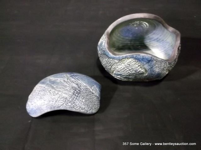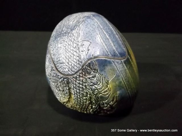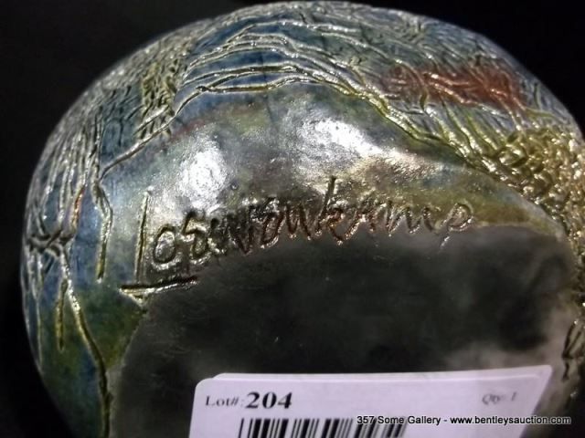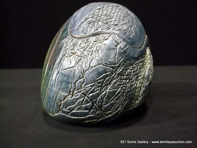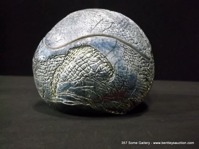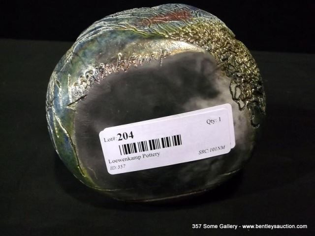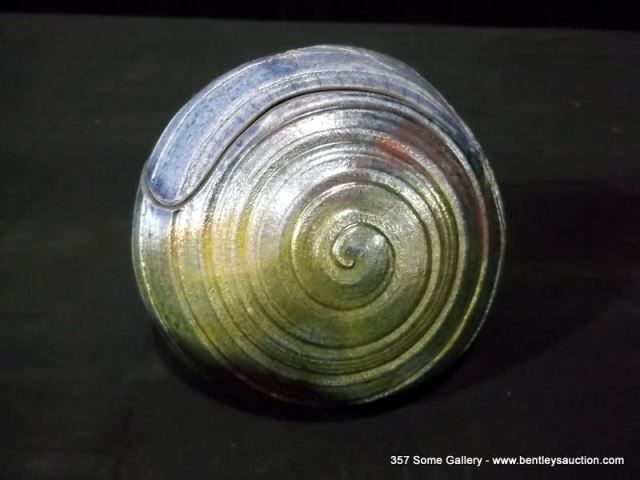Loewenkamp Pottery, Raku Pill-Shaped Container w/ Lid 4 1/2"x5 1/8" Retail: $135.00