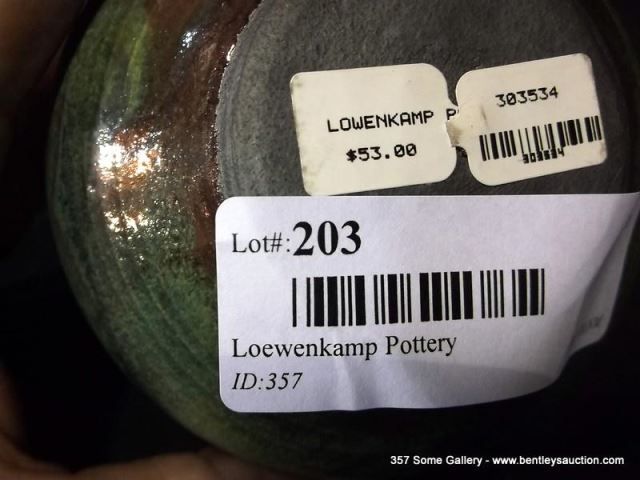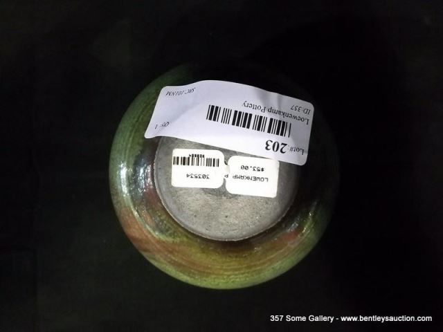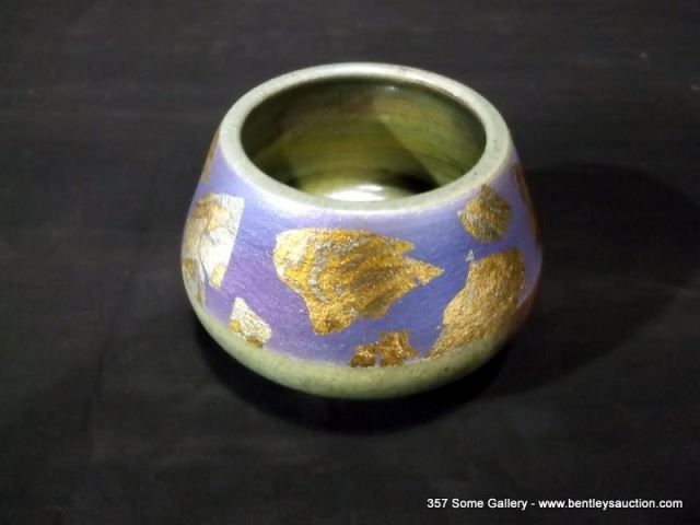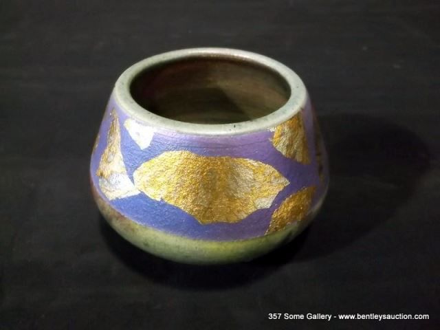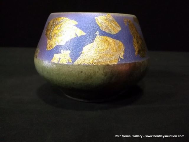 Loewenkamp Pottery, Small Raku Bowl Containing Reticulated Gold and Metallic Blue 3"x3 7/8"x3 3/8" R