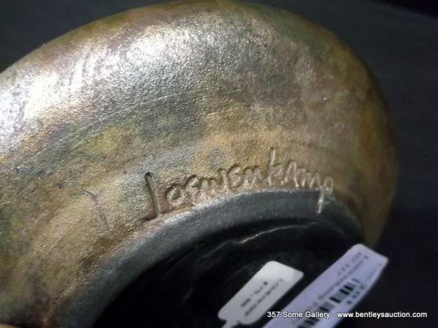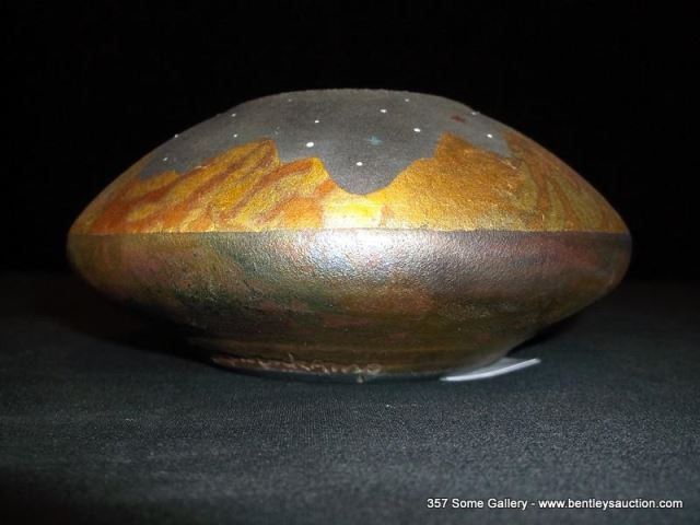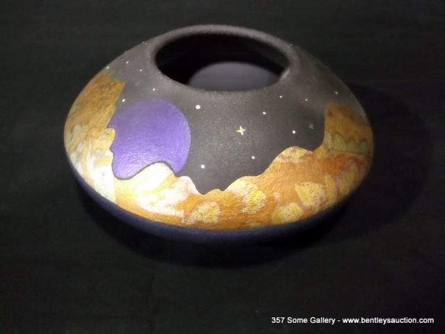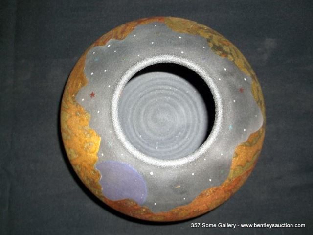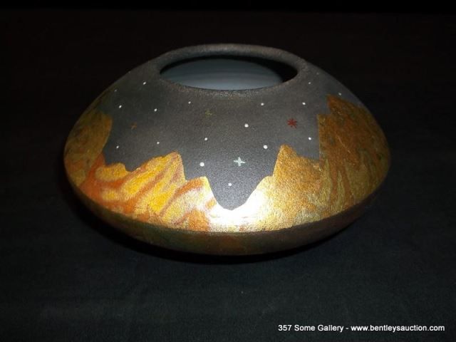 Loewenkamp Pottery, Small Raku Fired Bowl Containing Gold Mountains and Stars 2 3/4"x5 1/4"x2 1/8" R