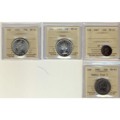 Lof of 4 ICCS MS63 coins, includes, 1967 10¢, 1960 50¢ Cam, 1965 50¢ MS63 and 1982 50¢ Type 2