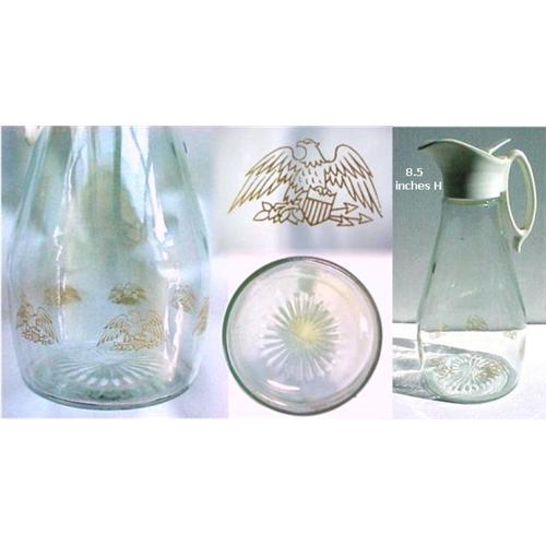 Log Cabin vintage syrup pitcher, ca. 1950s, fun advertising collectible that is also useable. Lower portion of this Log Cabin pitcher is stenciled with six gilt eagles Great Seal of US. White plastic pouring cover has thumbpiece molded with Log Cabin emblem. Starburst pattern deeply molded underfoot.