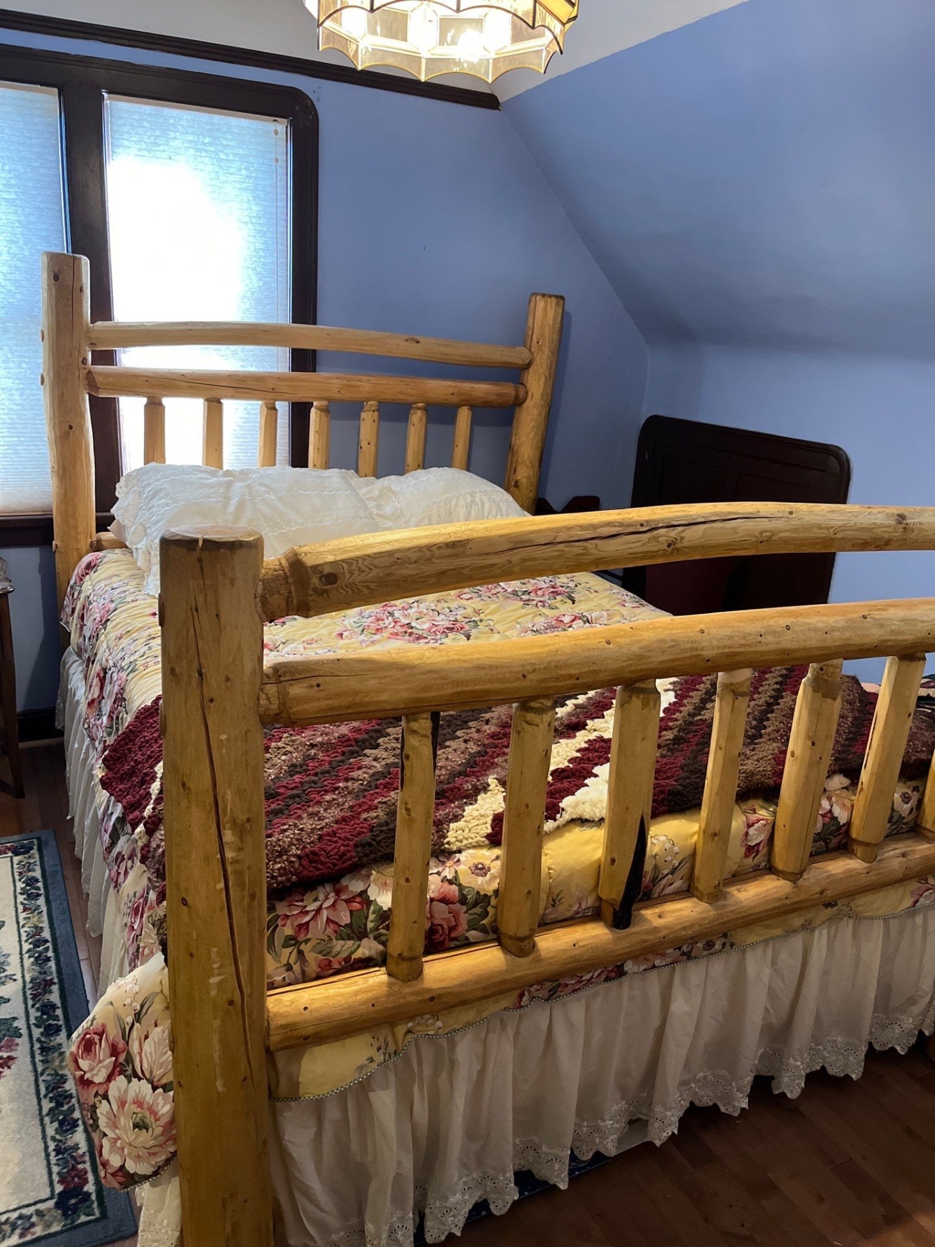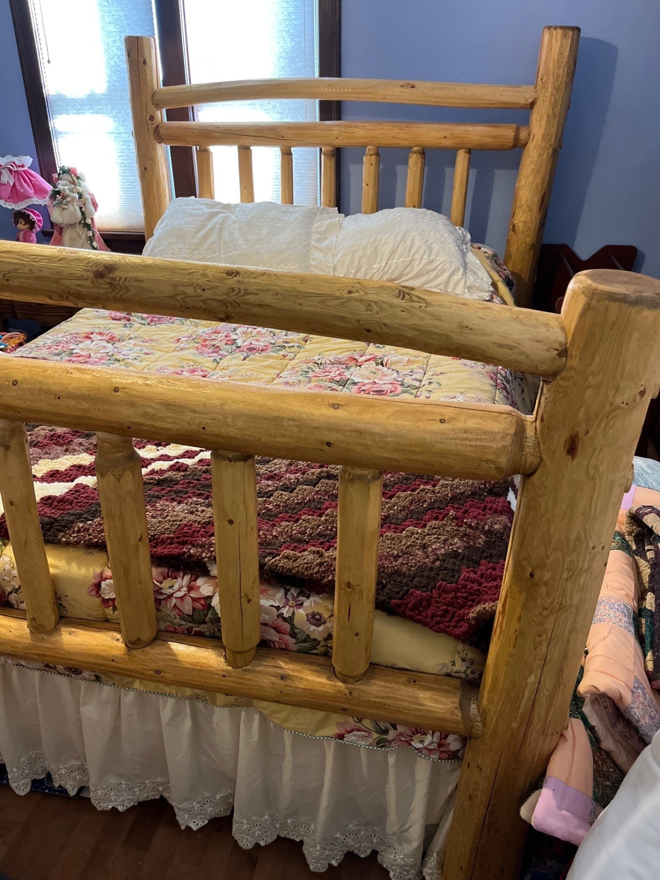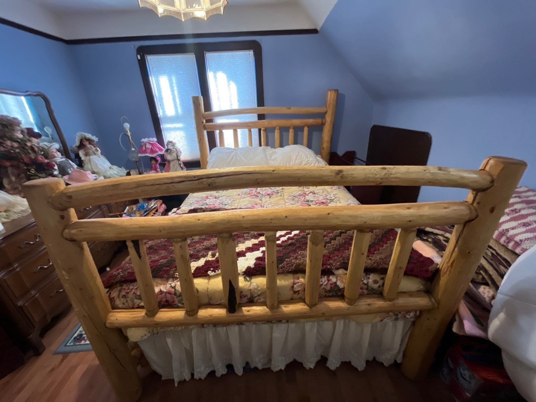 Log hand made Queen size bed with head board, footboard and side, rails, bedding, (mattress, and box spring not included)