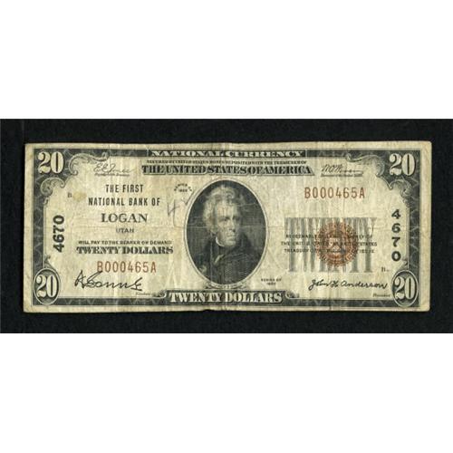 <B>Logan, UT</B></I> - $20 1929 Ty. 1 <B>The First NB</B></I> Ch. # 4670<BR> An average circulated example from this highly regarded state. <B>Fine</B></I>.<BR><I>From The Walla Walla Collection</B></I><BR><BR><b>Shipping:</b> Coins & Currency (<a target="_blank" href="http://www.heritageauctions.com/common/shipping.php">view shipping information</a>)