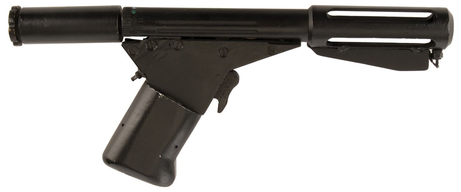 123. Logan's Run "Sand Man" hero pyrotechnic flame pistol prop. (MGM, 1976) Vintage original hero functional prop flame pistol. Constructed of cast metal and resin components and expertly assembled to appear as a futuristic handgun. Featuring futuristic gun frame and smooth grip with main barrel and flash suppressor barrel with lower gun fin, blunt trigger with no guard, a screw-on end cap and small depressing button at the back of the grip that may have released the fuel to facilitate a flame when the trigger was pulled, causing a spark to ignite the fuel. Retaining the interior mechanics for pyrotechnic FX including a cartridge chamber in the back body and a battery concealed in the grip. Expertly finished in iron black with some colored dots painted on the upper back body. Highly visible in the Sci-Fi movie as used by the "Sand Men", assassin officers employed to hunt down and dispatch citizens who run from mandatory euthanizing when they reach the age of 30. The gun is used like a traditional gun, but emits a spectacular flash of fire from the 4-muzzle ports rather than a bullet. Measuring 13 x 5.25 x 1.5 in. Exhibiting age and production use. Electronics untested. In vintage very good to fine condition. Provenance: Camden House, June, 1996. $4,000 - $6,000