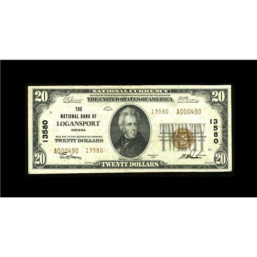 <B>Logansport, IN</B></I> - $20 1929 Ty. 2 <B>The NB of Logansport</B></I> Ch. # 13580<BR>A high grade example from the last of five banks chartered here. <B>Very Fine+.</B></I>