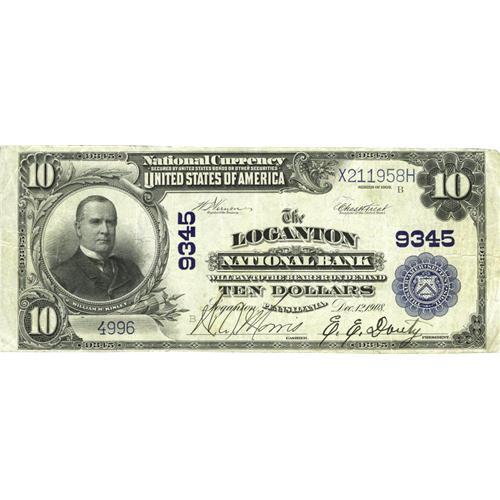 <B>Loganton, PA</B></I> - $10 1902 Plain Back Fr. 626 <B>The Loganton NB</B></I> Ch. # 9345<BR>Loganton featured only one National Bank and at the end of the National Bank issuing period in 1935, a reported $1,320 of large size notes was still outstanding. Today, this newly reported specimen brings the total large size survivors to two. The other is not nearly as nice as this pen signed, wholly original. <B>Very Fine+.</B></I>
