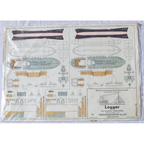 This is a sealed original Logger boat card model that is in fine condition. It includes the instruction book and has one small ½" tear (although the plastic is still totally intact) that does not encroach in any way on any of the pieces and a crease in the upper left corner (see pics). This is an early model because it does not have a date printed on it as they started doing in the 1960's and it is a Lehrmittelinstitut which is the original company. All printing and documentation are in German. Don't miss the chance to add this extremely rare piece to your collection today.<p>Paper card boat models began in the 1940's and continues on today. Wilhelmshaven was one of the premier producers of these hobby items and at the bottom of this is a short history of the company if you are interested. Finding the old boat card models is extremely rare because these were cut up and built, then played with and they finally wound up in the trash or waterlogged in a lake somewhere (those paper subs lob some pretty good torpedoes!!). Company info from the Wilhelmshaven website: The History Unofficial records date the Lehrmittelinstitut, a predecessor of Wilhelmshaven back to the 1940's. This predecessor company was producing models for the army, who used it as visual training tool for recognition. But no official records exist to date back the founding of the company. So Wilhelmshaven is dating itself back to the first official record of 1953, which is the registration of the Lehrmittelinstitut. ...