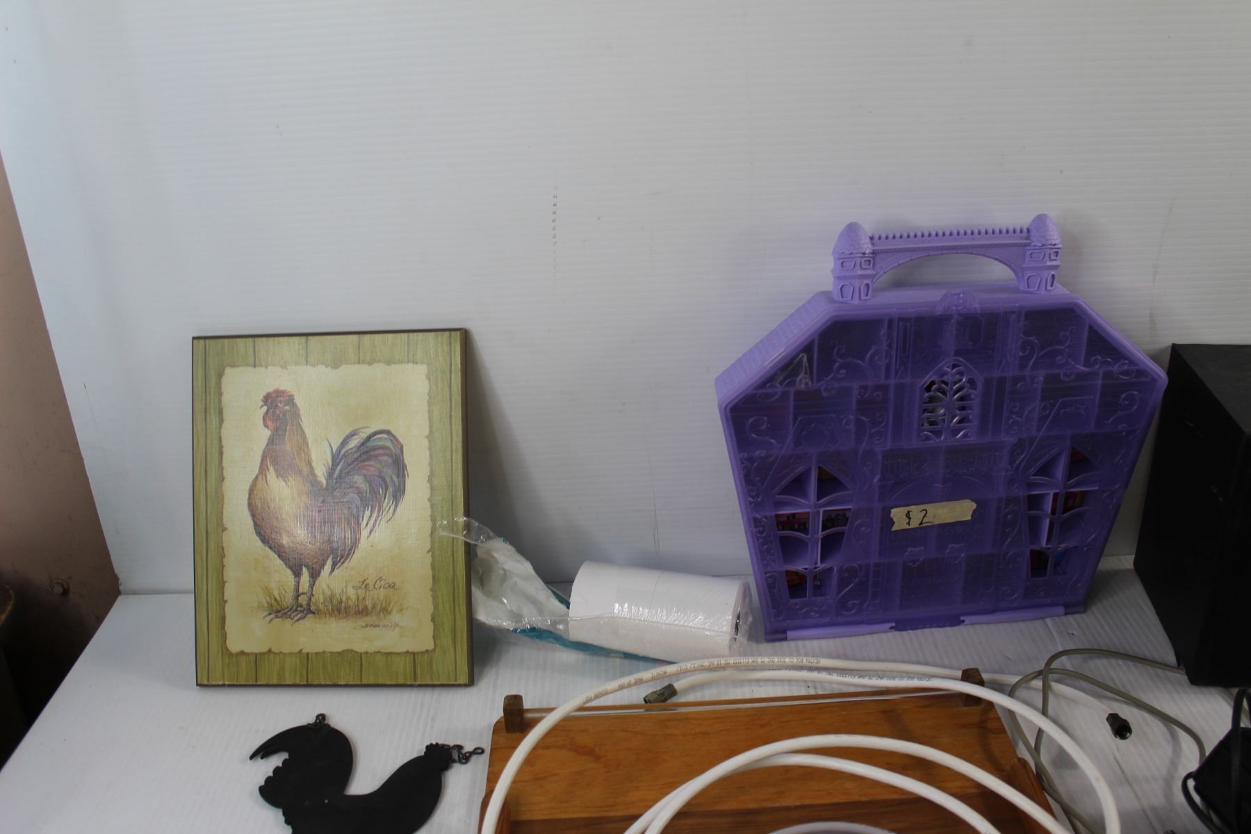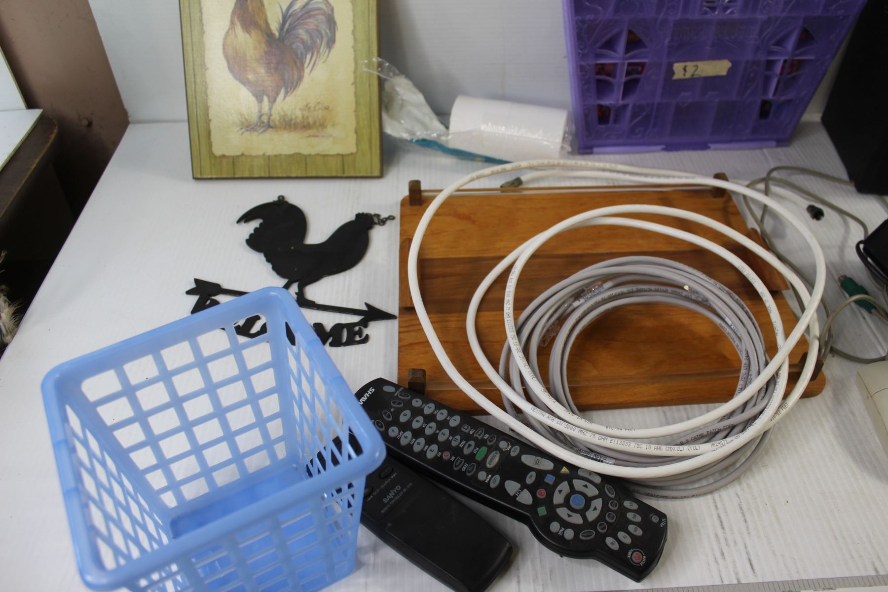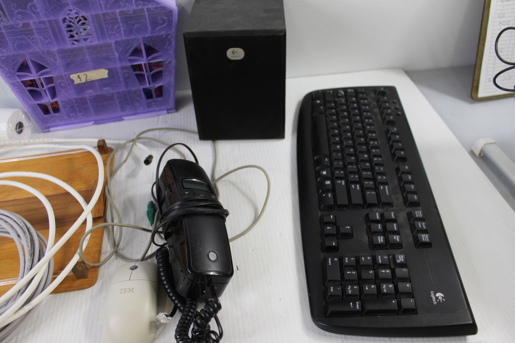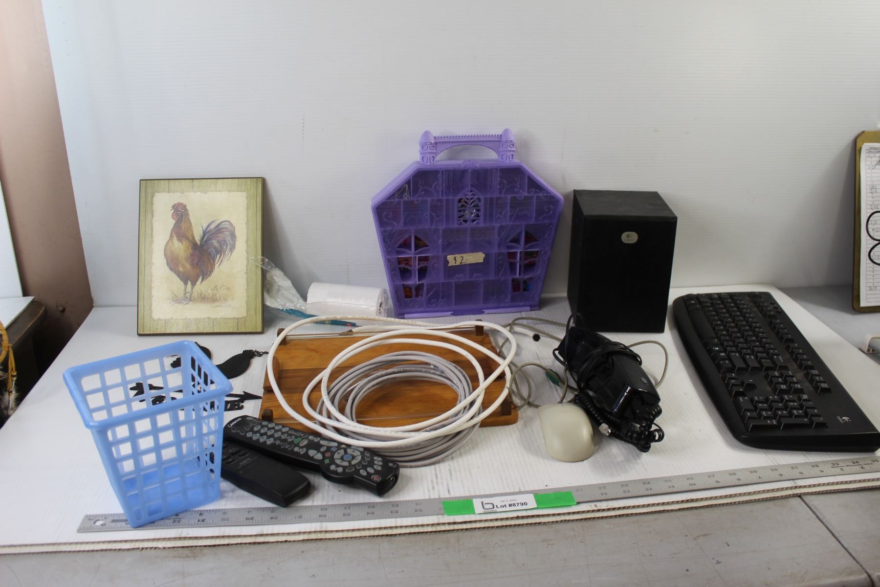 Logitech Keyboard, (2) Remotes, Logitech Speaker, Welcome Sign, Misc.