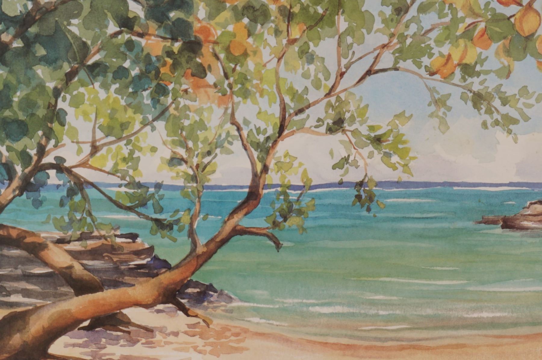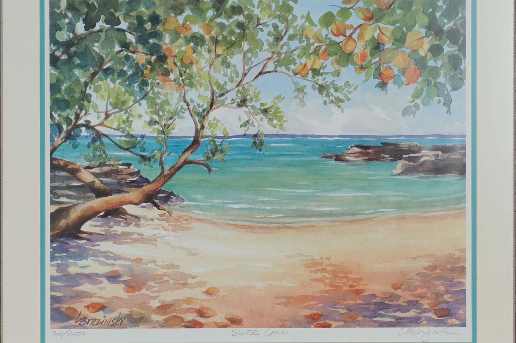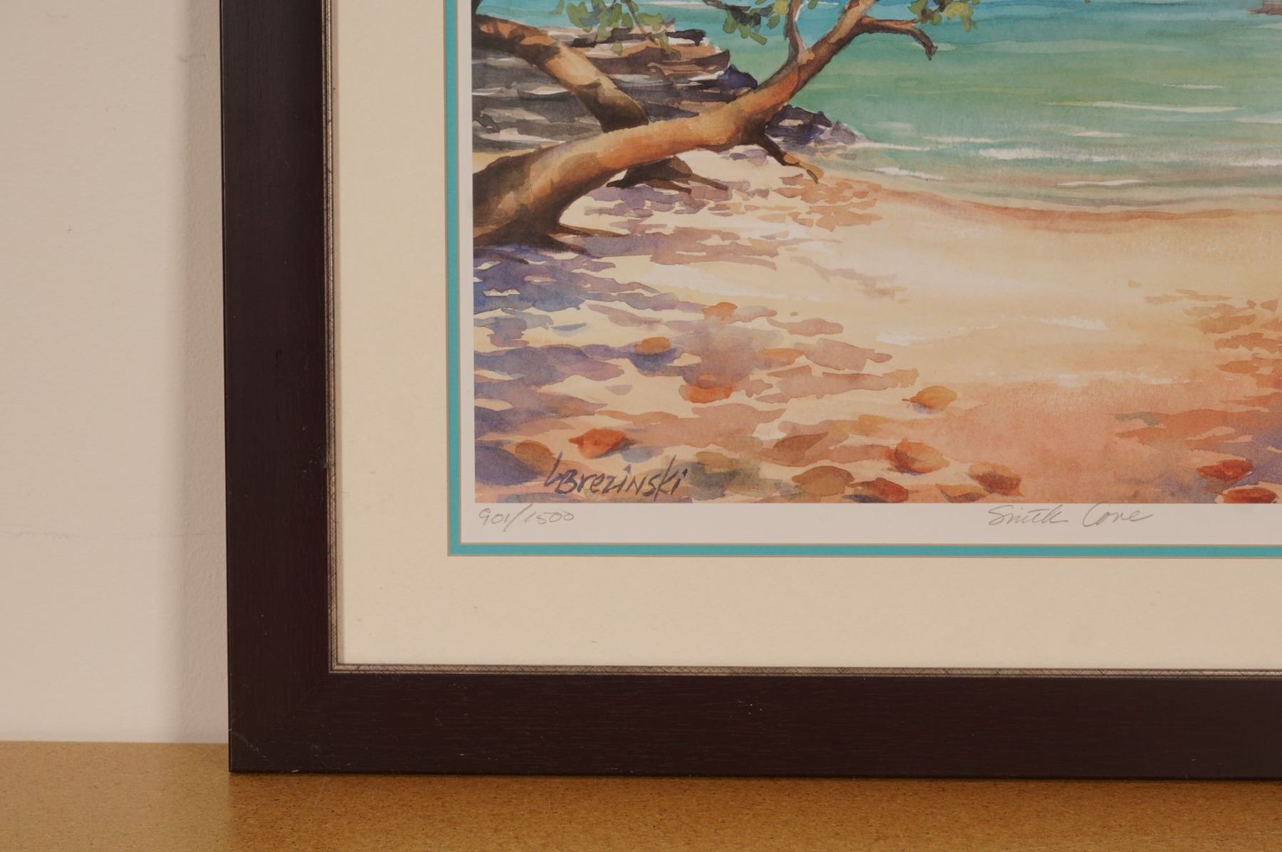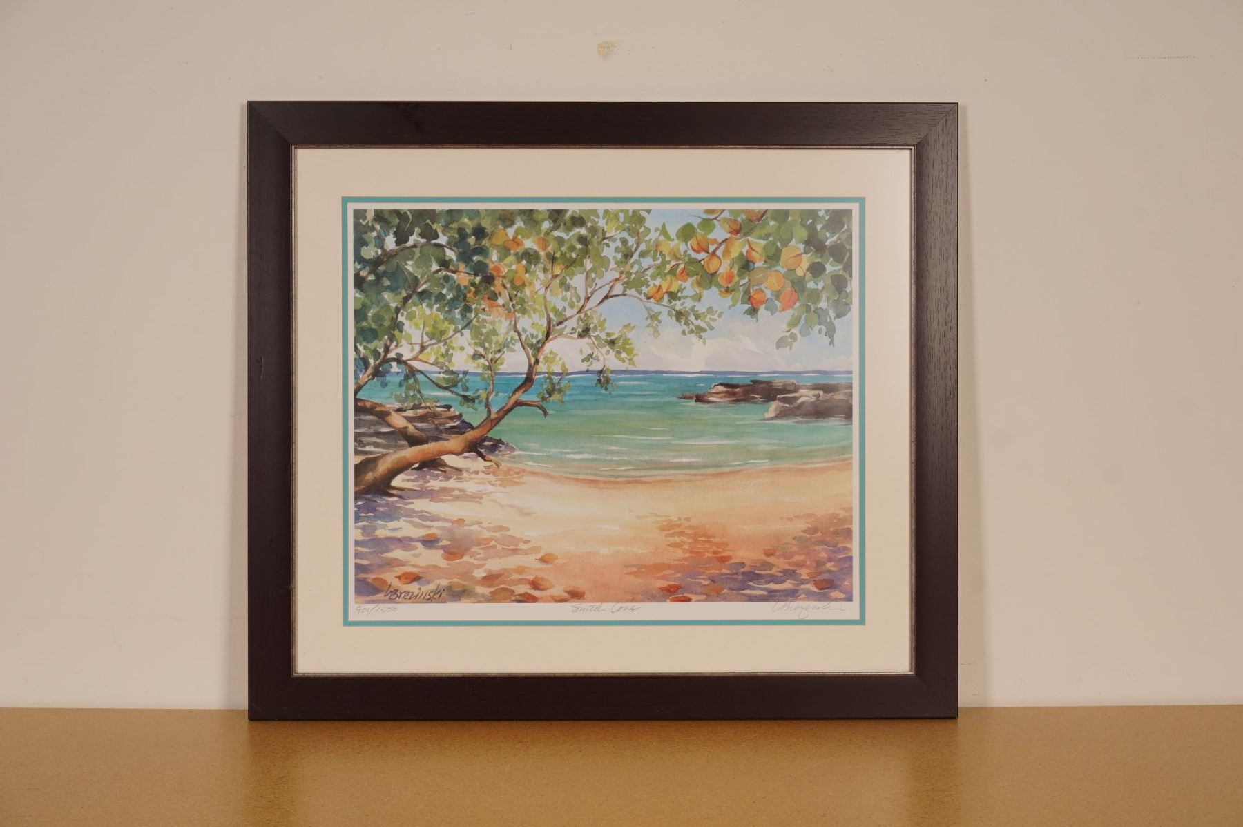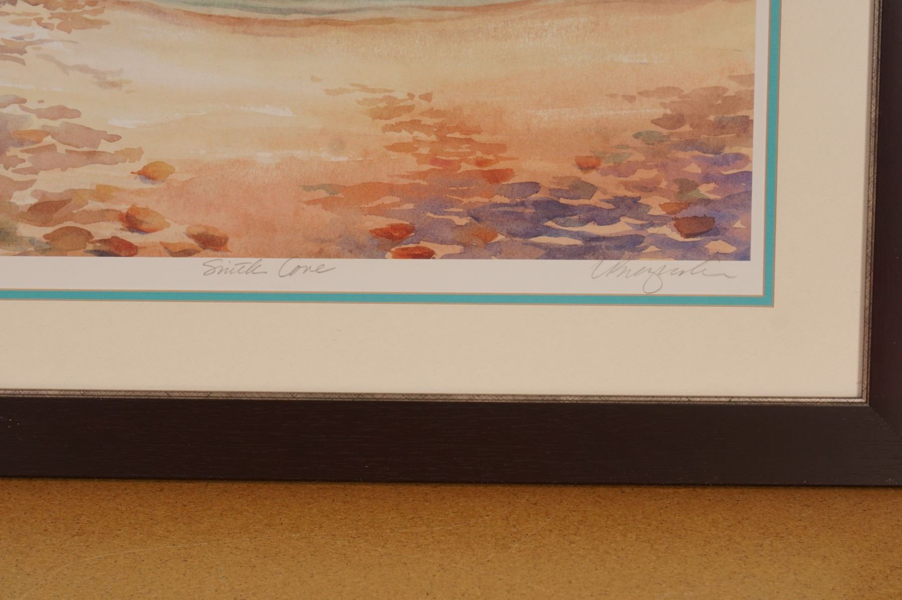 A captivating coastal landscape by American artist Lois Brezinski, titled Smith Cove. This limited edition lithograph beautifully portrays a tranquil beach framed by overhanging foliage, shimmering turquoise waters, and warm sunlit sands. Brezinski's delicate watercolor-inspired technique and vivid palette evoke the serenity of seaside life and her signature appreciation for nature's light and rhythm. Numbered 901/1500 and signed in pencil by the artist, this piece is elegantly double-matted in cream and turquoise and housed in a dark wood frame with professional backing and hanging wire.