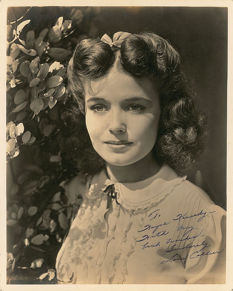 Actress (1919–1999) who played heroine roles in B-movies, and made appearances with the Marx Brothers and Abbott and Costello. Pretty vintage matte-finish 8 x 10 portrait of Collier, signed and inscribed in fountain pen “To Wayne Kennedy—With my best wishes, Sincerely, Lois Collier.” Light corner tip creasing, a couple surface impressions, slight brush to the inscription, and light silvering to dark areas of the background, otherwise fine condition.