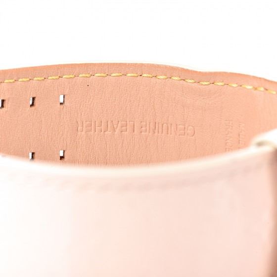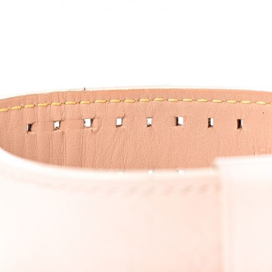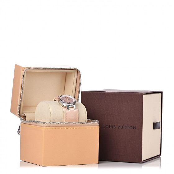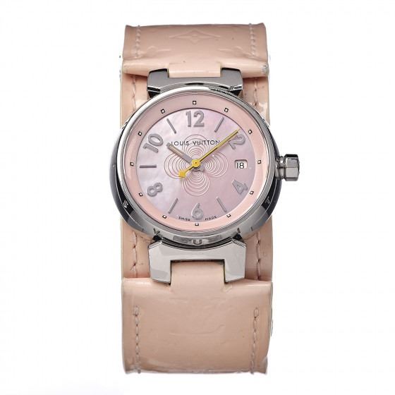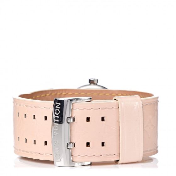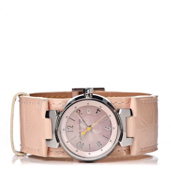 Pink watch is crafted of stainless steel and features a Vernis calfskin leather band. Features also include a pink mother of pearl dial with a central monogram fleur motif, bold hour markers, a date display, and Swiss quartz movement.