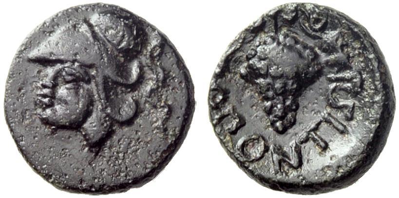 Lokris. Lokri Opuntii. Bronze, 340’s BC. Æ 1.75 g., 1¢. Helmeted head of Athena left. Rev. Bunch of grapes, OPONTIWN from top l. anticlockwise. Corpus group 4, 4a. Very rare. Of the five known only one is in a public collection (Athens), the others in the writer’s collection. Black patina with some light pitting, otherwise good very fine.