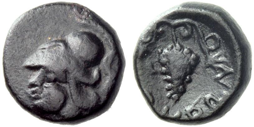Lokris. Lokri Opuntii. Bronze, 340’s BC. Æ 2.57 g., 7¢. Helmeted head of Athena left. Rev. Bunch of grapes, [L]OKPWN from top l. anticlockwise. Corpus group 5, 1a. Extremely rare, one of two known and a coin of great importance, linking the OPONTIWN and the LOKPWN issues. Slightly off-centre but with a nice black patina and very fine.