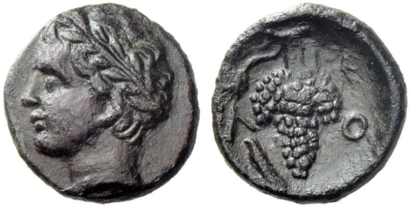 Lokris. Lokri Opuntii. Bronze, third or last quarter of 4th century BC. Æ 2.01 g., 12¢. Head of Apollo l. with short hair, of later, Hellenistic style. Rev. Bunch of grapes hanging from stalk, tendrils and vine leaves to l. and r. To l., L, and below cnemis as symbol, to r. O. Corpus group 16, 2a. Weber 3150. Nice dark chocolate brown glossy patina and extremely fine.