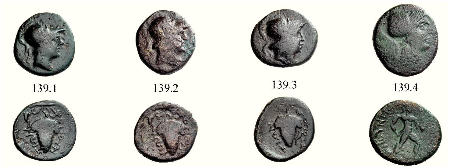 Lokris. Lokri Opuntii. Lot of four bronze coins, 2nd century BC. 139.1: Æ 3.78 g., 3¢. 139.2: Æ 4.45 g., 10¢. 139.3: Æ 4.43 g., 8¢. All with Athena helmeted r. Rev. Bunch of grapes hanging from stalk, to l. and r. tendrils and vine leaves; to l. or to r., symbol cornucopiae. OPOYN r. down, TIWN l. up. 139.4: Æ 5.64 g., 3¢. Athena helmeted r. of different style, in lower relief and on a larger flan. Rev. Naked and helmeted warrior (Ajax) advancing r. with spear and shield, to l. OPOYNTIW[N] up circular. Four very rare coins offered together: 139.1 and 139.2 are two of only four known, 139.3 is the only one known of this variety and 139.4 may also be unique (see note below). Good fine.