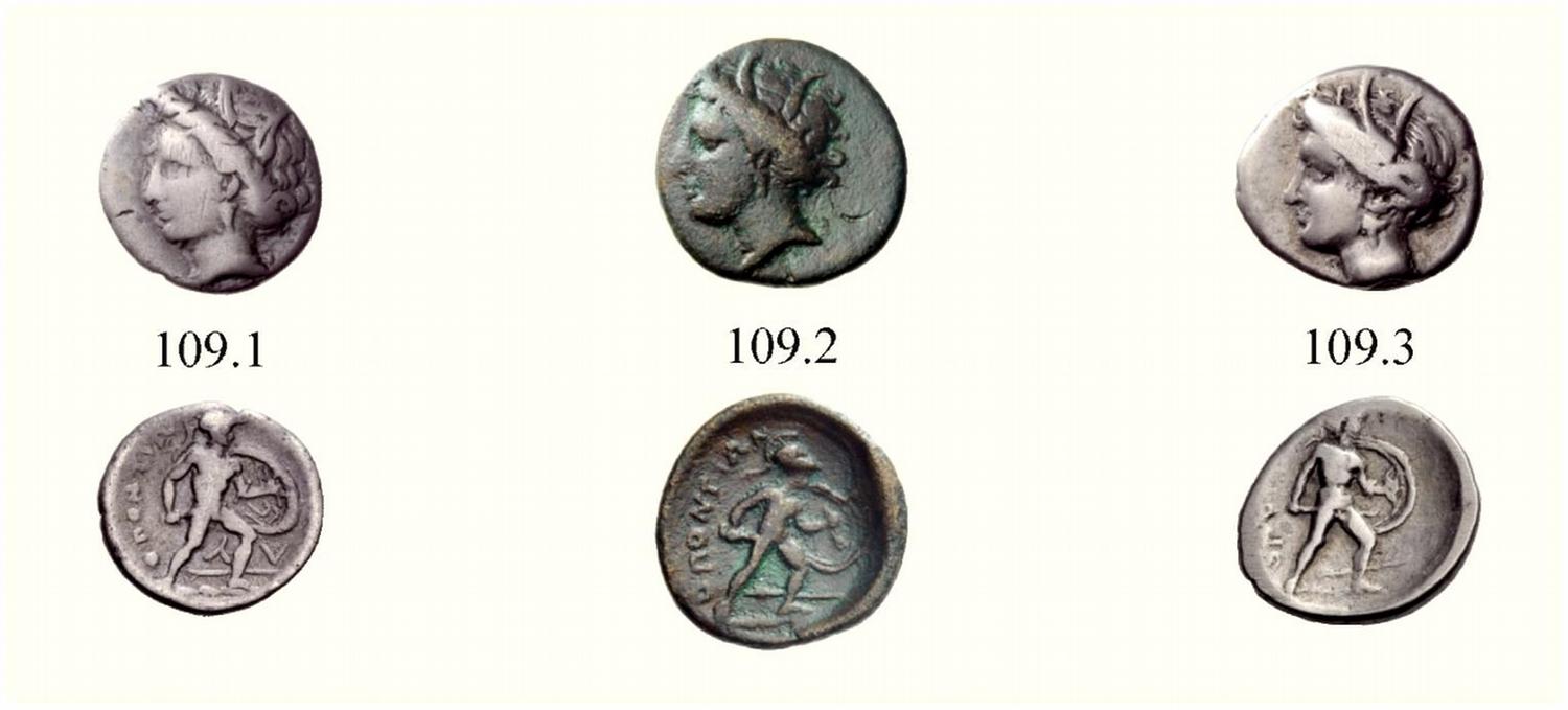 Lokris. Lokri Opuntii. Lot of three coins. 109.1: Hemidrachm, 340’s BC or later. AR 2.11 g., 4¢. An underweight “barbarous” ancient imitation of group 5. 109.2: Æ 1.87 g., 12¢. A modern cast copy of a group 7 hemidrachm. 109.3: Hemidrachm, 340’s BC or later. AR 2.49 g., 7¢. An ancient imitation in poor style of a group 8 coin. Fine to about very fine. 109.3: Ex Wallace collection and IGCH 205.