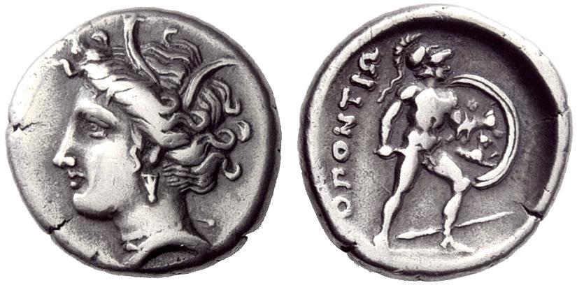Lokris. Lokri Opuntii. Triobol or hemidrachm, 340’s BC. AR 2.73 g., 12¢. Head of Demeter l. Rev. Ajax advancing to r., spear to l. on the ground, symbol inside the shield, lion. OPONTIW l. up. Corpus group 8, 145p. SNG Lockett 1697 (same dies). Attractively toned with contrasting highlights, very fine. Ex Giessener Münzhandlung 31 (24 April 1985) 106 (DM 490).