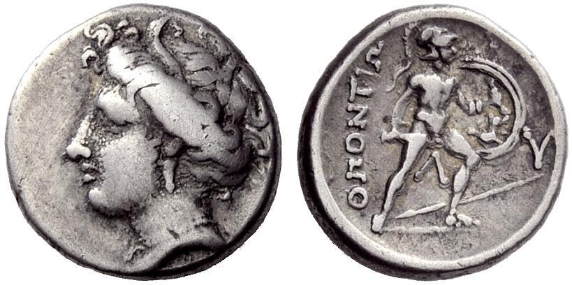 Lokris. Lokri Opuntii. Triobol or hemidrachm, 340’s BC. AR 2.74 g., 11¢. Head of Demeter l. Rev. Ajax advancing to r., on the ground, spear to l., between his legs, L, below his shield, U. Symbol inside the shield, lion. OPONTIW l. up. Corpus group 6, 133i. SNG Cop 54. Lightly toned and very fine / good very fine. Ex CH 7, 45, with a concealment date of c. 330 BC that would corroborate our dating.